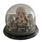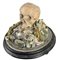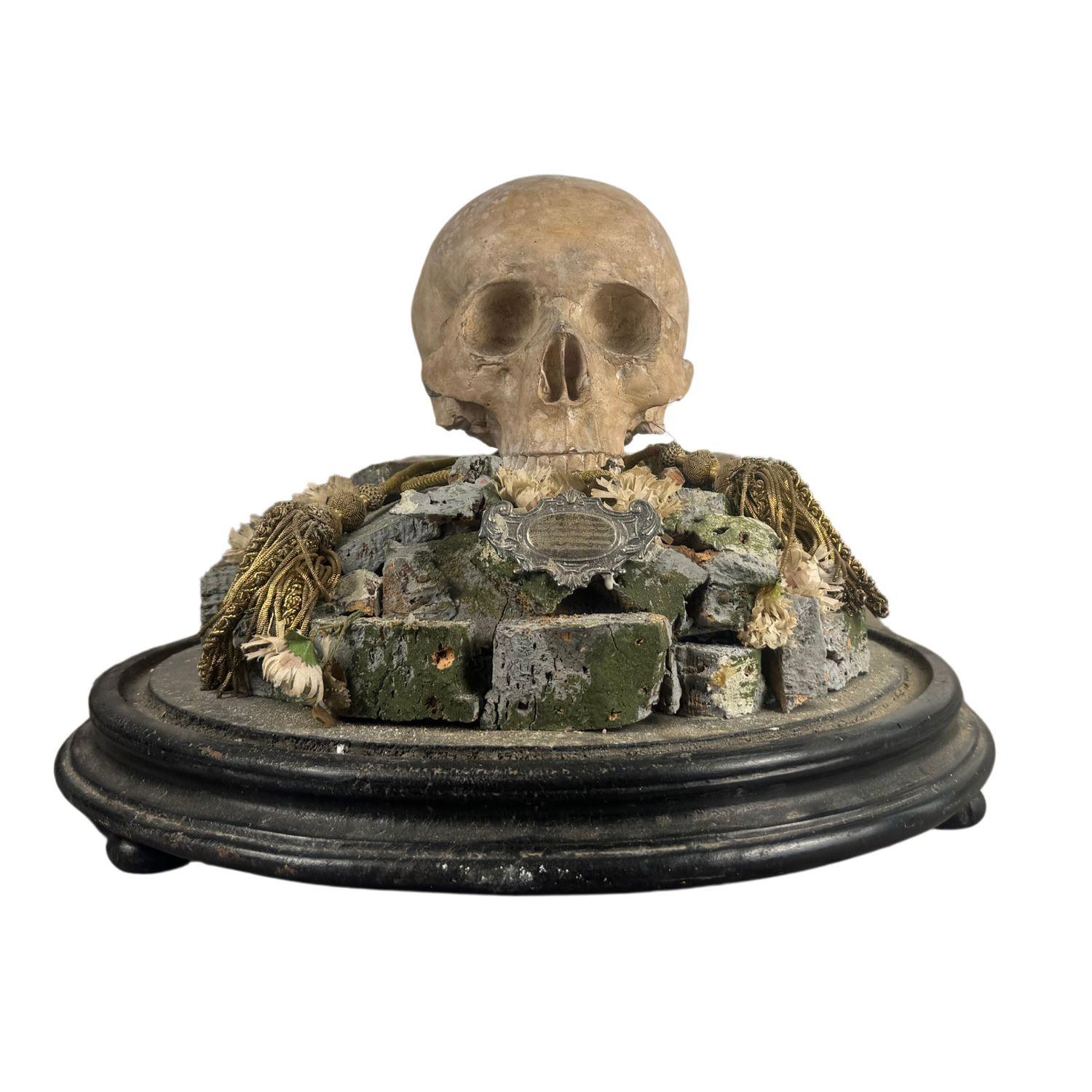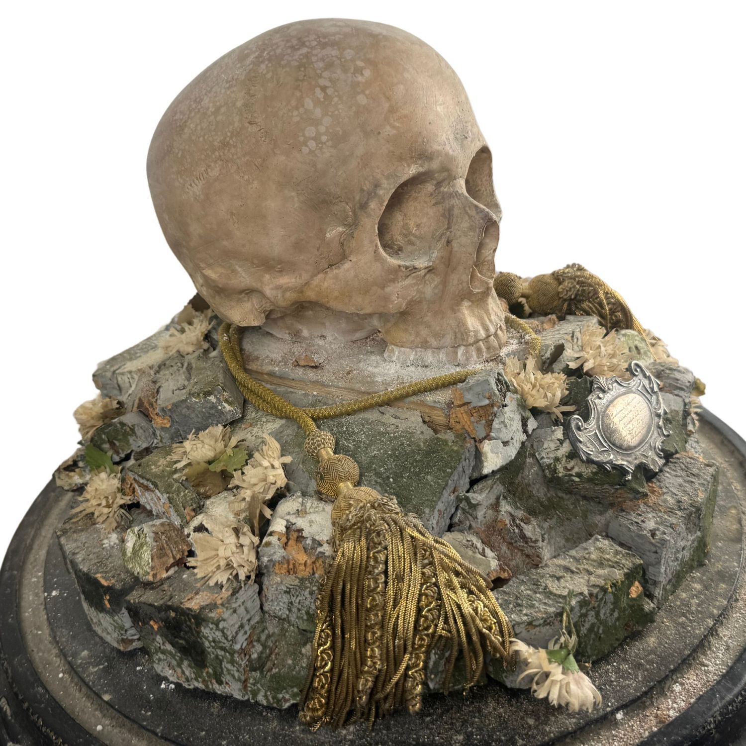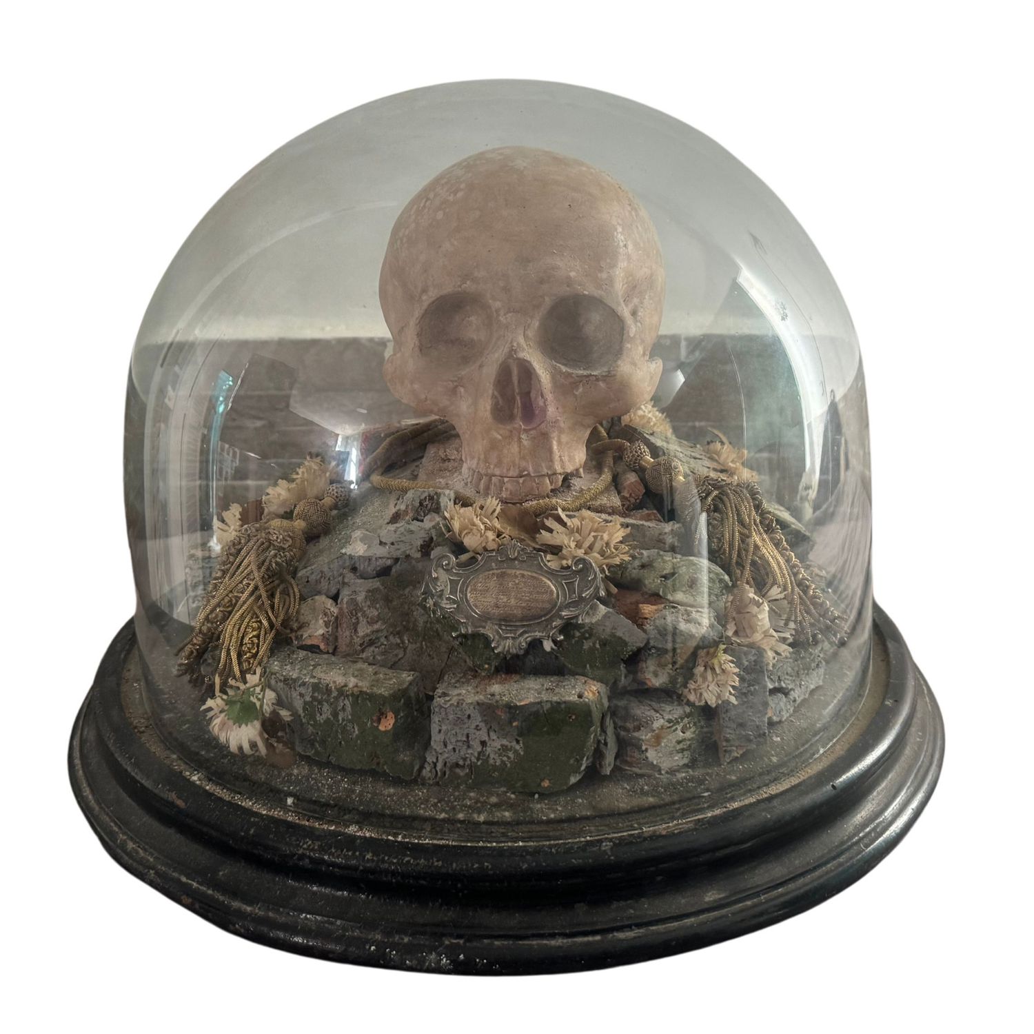 Teschio in scagliola sotto campana di vetro con base in legno.