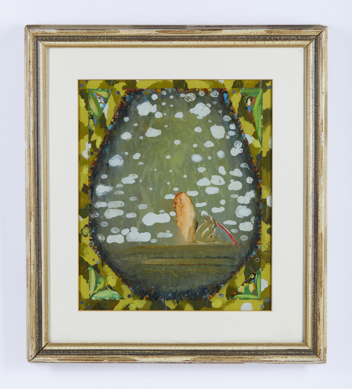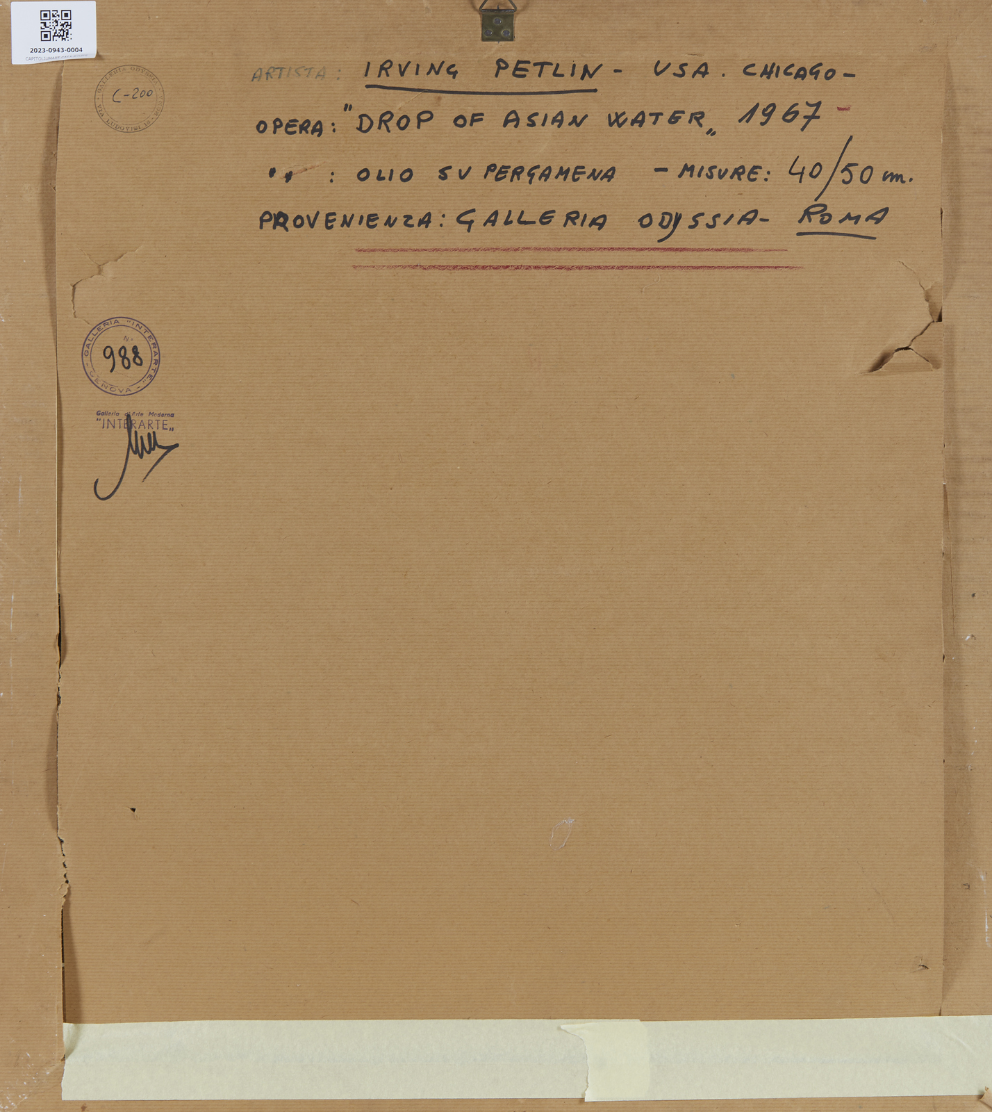 PETLING IRVING (1934 - 2018) SENZA TITOLO (DROP OF ASIAN WATER, 1967). Olio su pergamena. Cm 45,70 x 61,00. sulla carta della cornice al retro: iscrizione con titolo, data e timbri Galleria Interarte, Genova e Galleria Odyssea, Roma