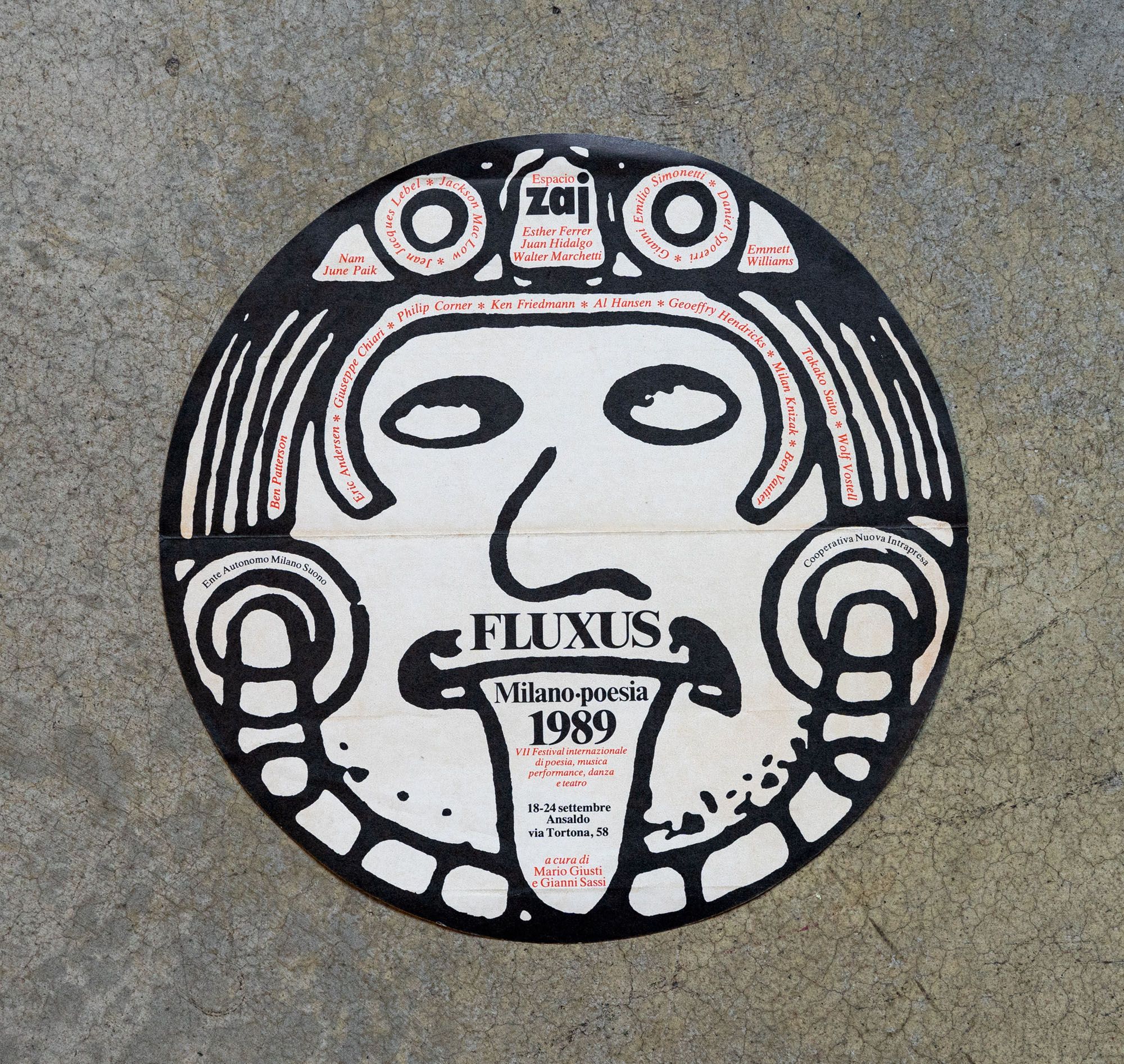 AUTORI VARIFLUXUS Milano-poesia1989Adesivo realizzato in occasione del VII Festival intrenazionale di poesia, musica, performance, danza e teatro, Milano (18 - 24 settembre 1989)Diametro 22,7 cmSenza difetti