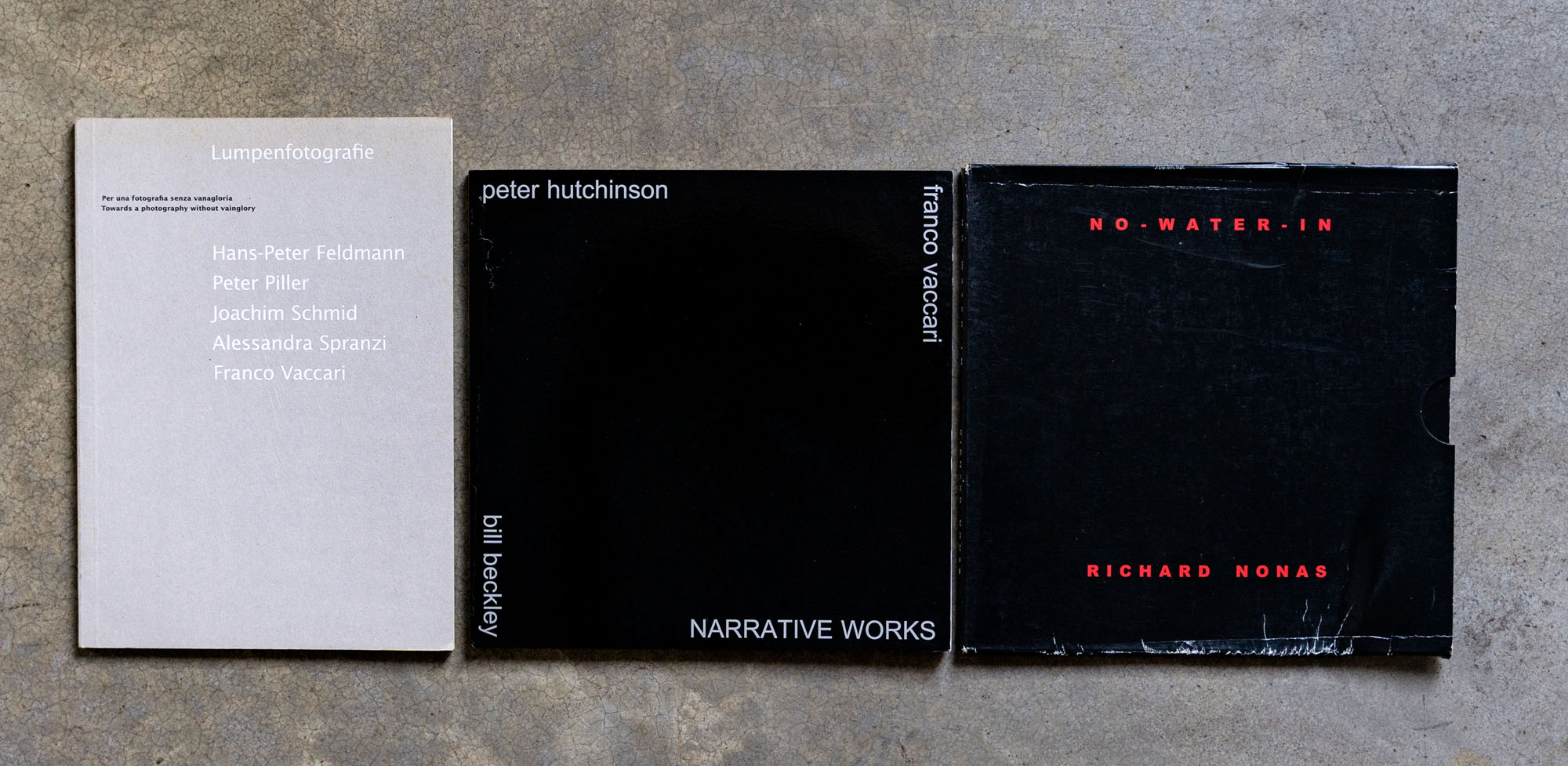 LOTTO MULTIPLOLotto di tre catalogiRichard Nonas - No-water-in2011Catalogo illustrato21,5 x 21,5 cmEdizione P420 Arte ContemporaneaDifettiBill Beckley, Peter Hutchinson, Franco Vaccari - narrative Works2011Catalogo illustrato21,5 x 21,5 cmEdizione P420 Arte ContemporaneaSenza difettiHans-Peter Feldmann, Peter Piller, Joachim Schmid, Alessandra Spranzi, Franco Vaccari - Lumpenfotografie2013Catalogo illustrato24 x 17 cmEdizione P420 Arte ContemporaneaSenza difetti