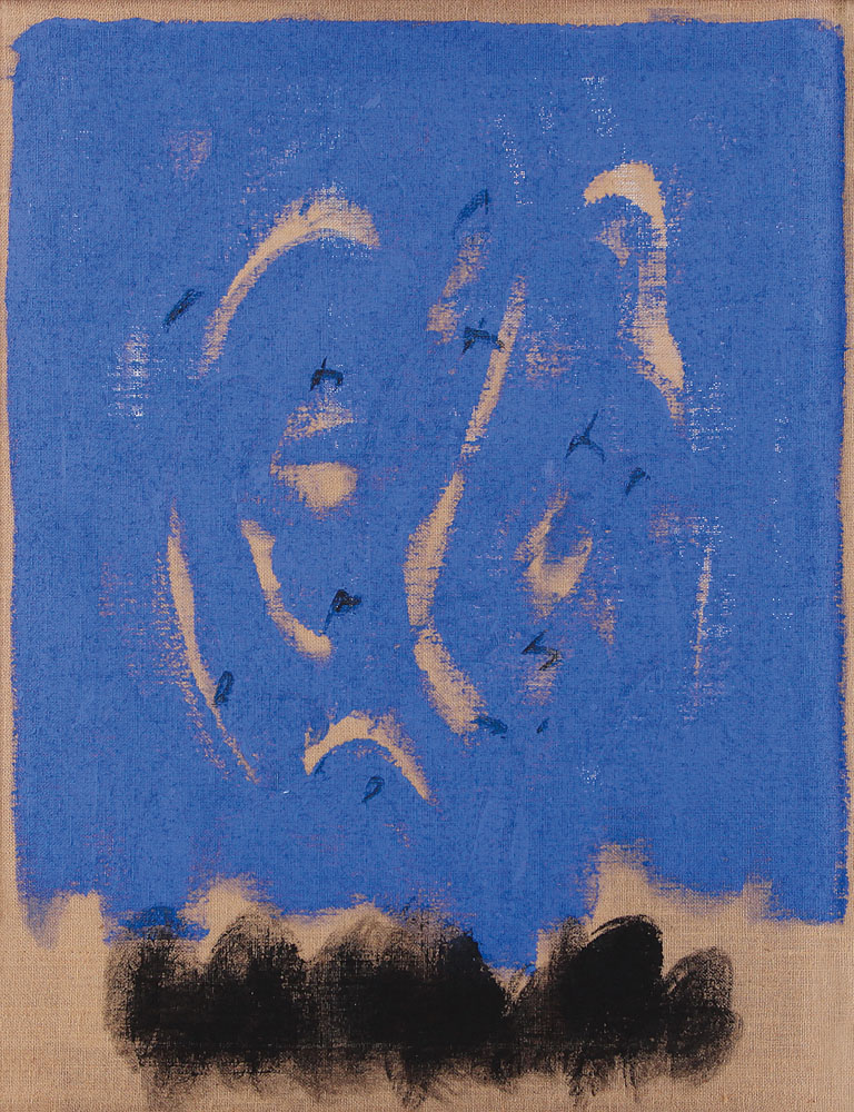 terra colorata su tela di juta cm. 90x70, firma e anno al retro, dichiarazione d'autenticità dell'artista su foto, entro teca in plexiglass.