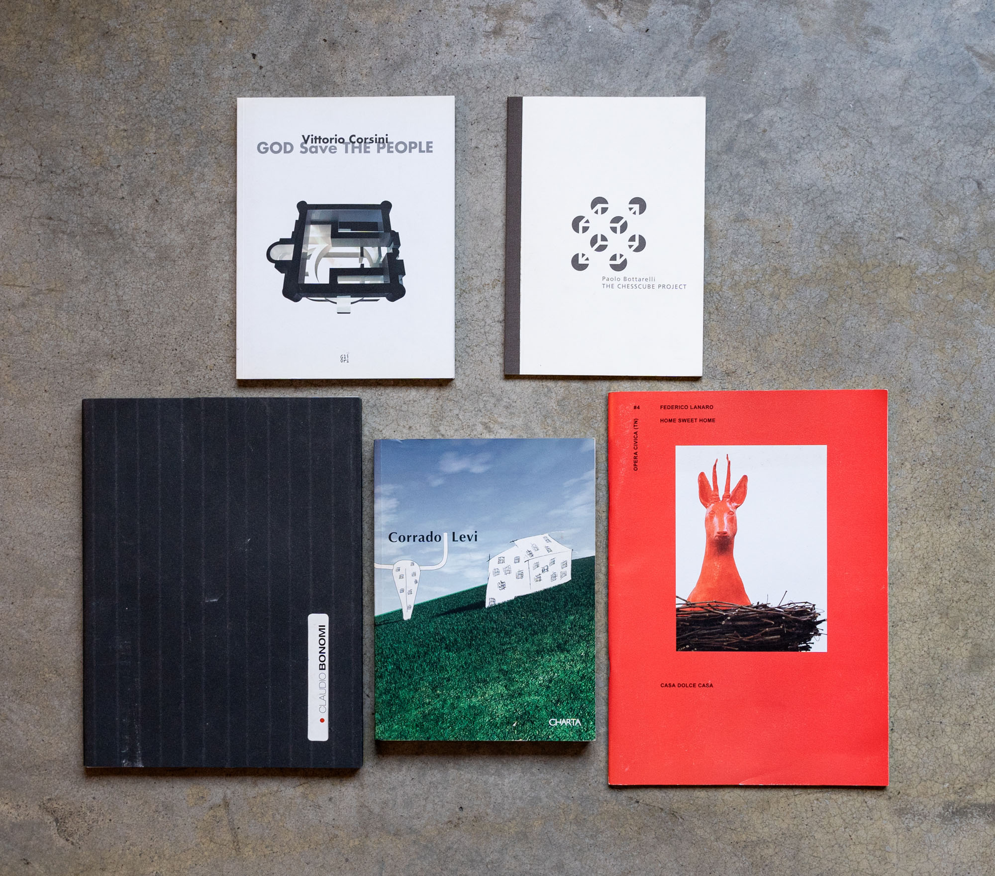 LOTTO MULTIPLOLotto di cinque cataloghiFederico Lanaro - Home sweet home (Casa dolce casa)2011Catalogo illustrato29,5 x 21 cmEdizione Kaleidoscope PressDifettiPaolo Bottarelli - The chesscube project2011Catalogo illustrato21 x 15 cmEdizione The Green BoxDifettiVittorio Corsini - GOD save THE PEOPLE2007Catalogo illustrato21 x 16,5 cmEdizione Gli OriSenza difettiCorrado Levi - Profili. Vedere l'arcobaleno con la coda dell'occhio2002Catalogo illustrato22,5 x 16,5 cmEdizione ChartaDifettiClaudio Bonomi - Trame (s)velate2005Catalogo illustrato28 x 21 cmDifetti