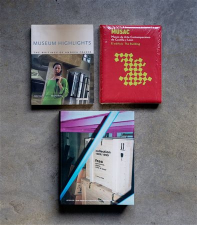 LOTTO MULTIPLOLotto di tre cataloghiCollection 1989/1999 Frac Provence-Alpes-Cote d'Azur2000Catalogo illustrato 26 x 20,5 cmEdizione Actes SudSenza difettiMuseum highlights. The writing of Andrea Fraser2005Catalogo illustrato 23 x 18 cmEdizione Writing Art SeriesDifettiMUSAC - Museo de Arte Contemporaneo de Castilla y Leon. El edificio / The building2006Catalogo illustrato 22 x 17,5 cmEdizione del museoNuovo con cellofan