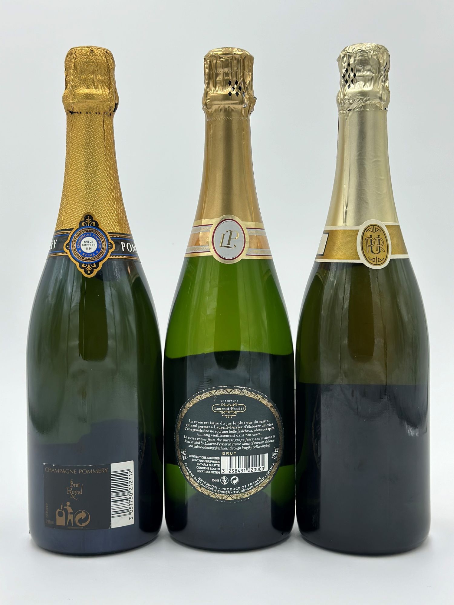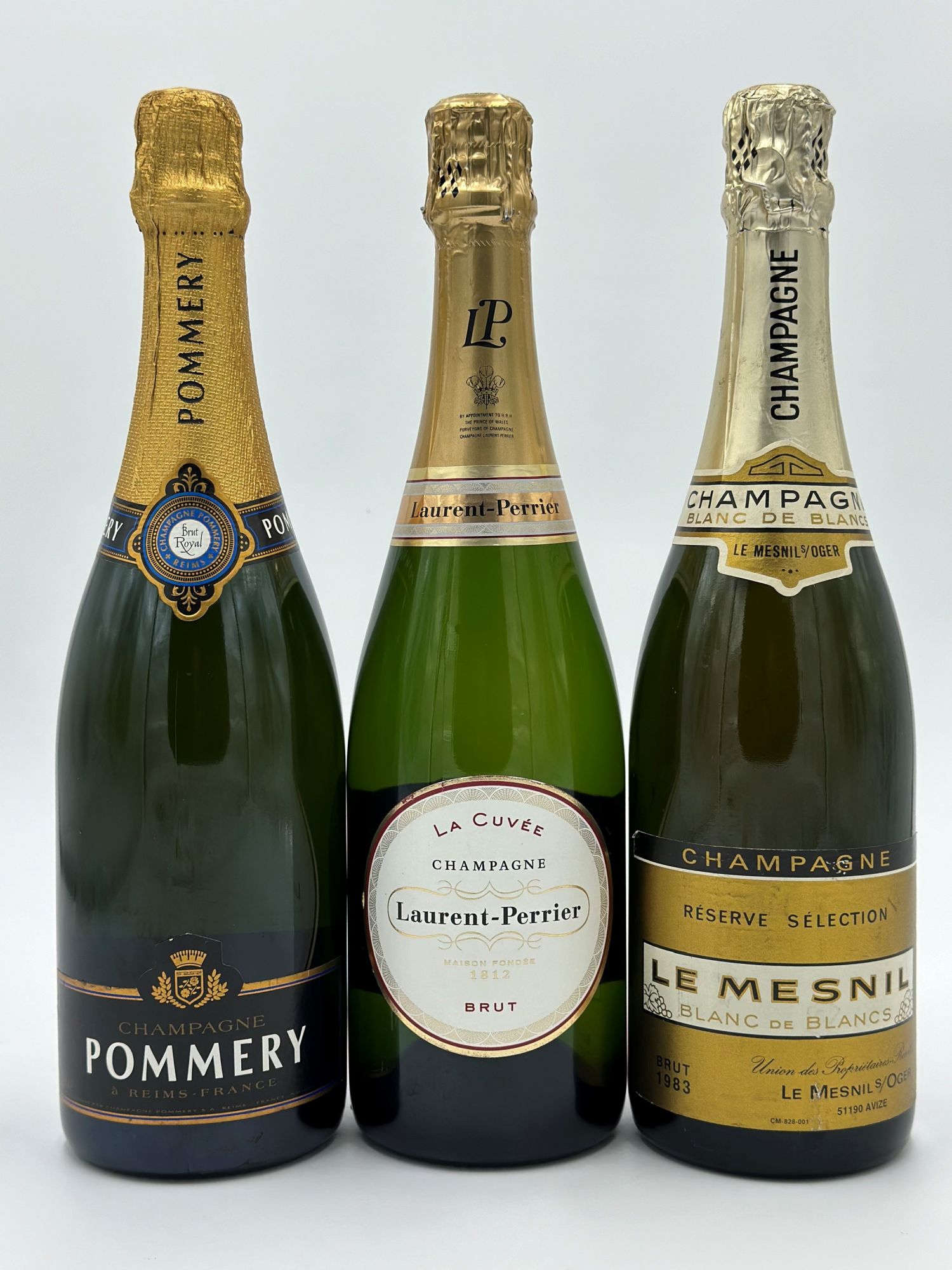 Francia-Champagne 0,75 a) Francia, Pommery Royal Brut - 1 bottiglia (bt). Livello: entro il collo (WN). Condition report: etichetta e capsula in perfette condizioni. b) Francia, Laurient Perrier La Cuvee Brut - 1 bottiglia (bt). Livello: entro il collo (WN). Condition report: etichetta e capsula in perfette condizioni. c) Francia, Le Mesnil Blanc de Blancs - 1 bottiglia (bt). Livello: entro il collo (WN). Condition report: etichetta e capsula in perfette condizioni.