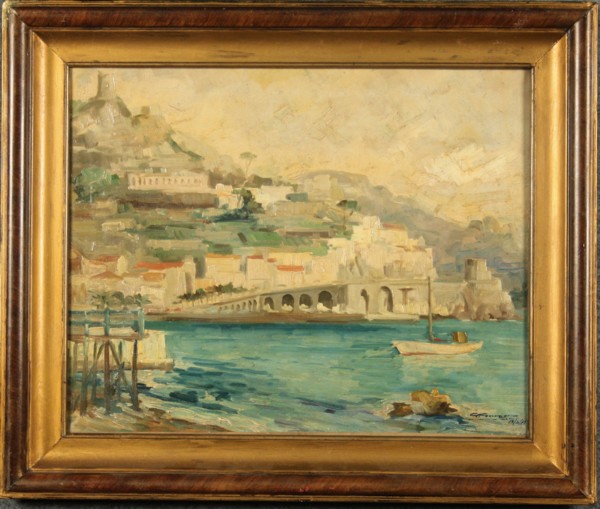 Dipinto olio su tela raff. ''PAESAGGIO CON BAIA''. Firmato G. GORZENO in basso a destra. XX secolo. In cornice. Mis. Lung. cm. 51 Alt. cm. 40 ca.