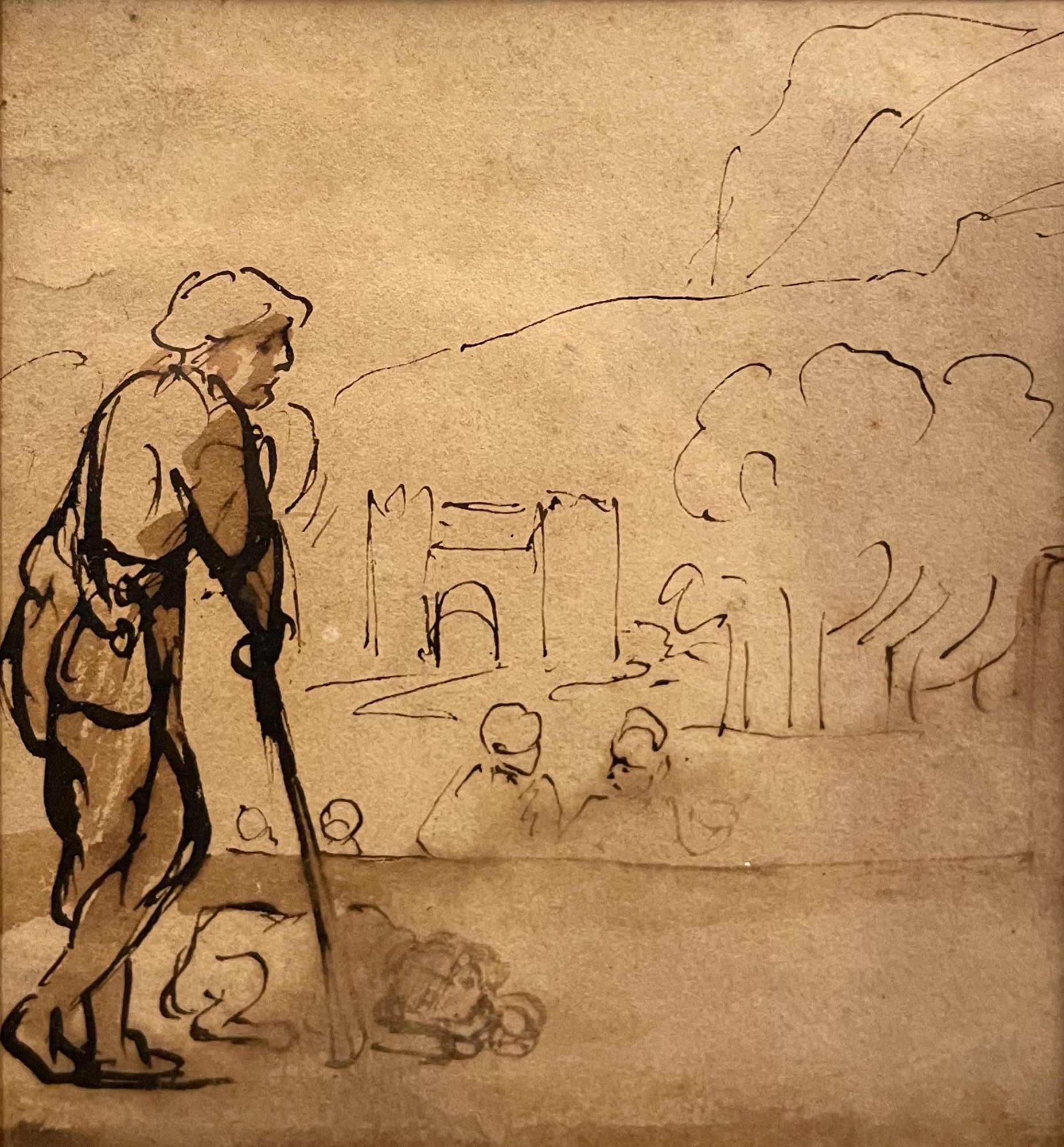 Justus de Gelder (attribuito a) (1650 - 1710) Viandante con cane e paesaggio penna e inchiostro su carta 12,3 x 11cm