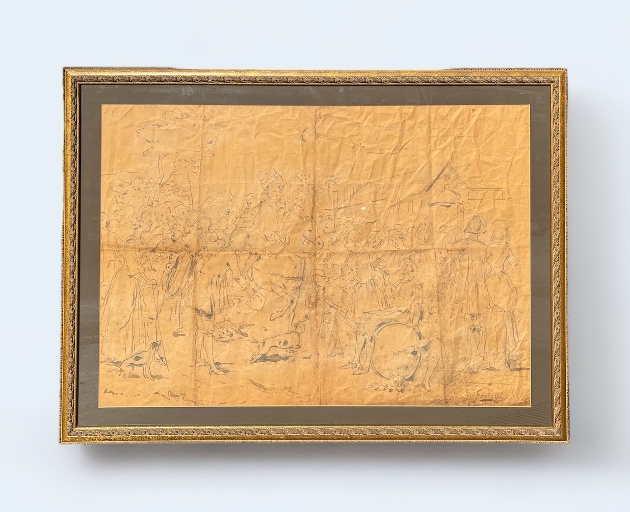 Firmato in basso a destra. Presenti fori per lo spolvero. In cornice.