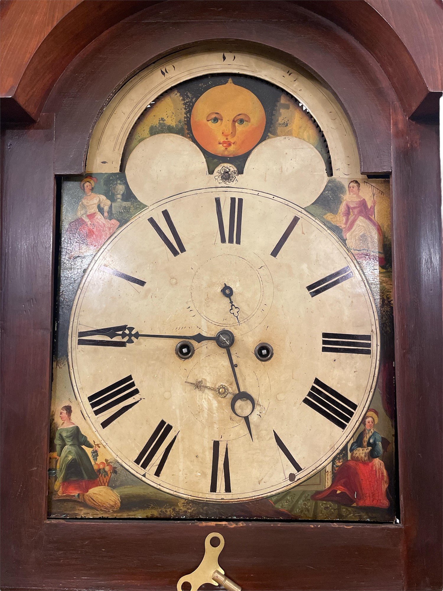in legno di mogano con quadrante a numeri romani e parzialmente dipinto con movimento a fasi lunari. Non marciante.