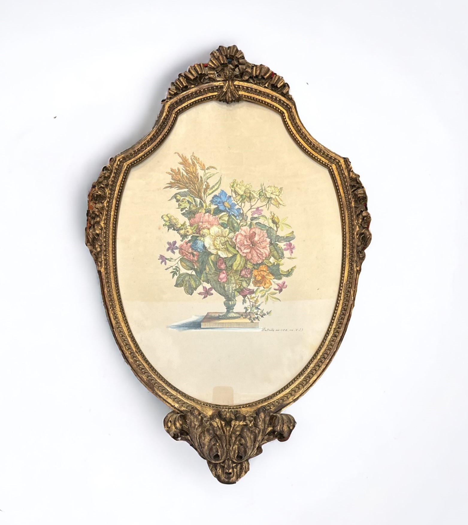 Cornice a scudo di forma centinata, in legno dorato e intagliato. Manifattura francese.