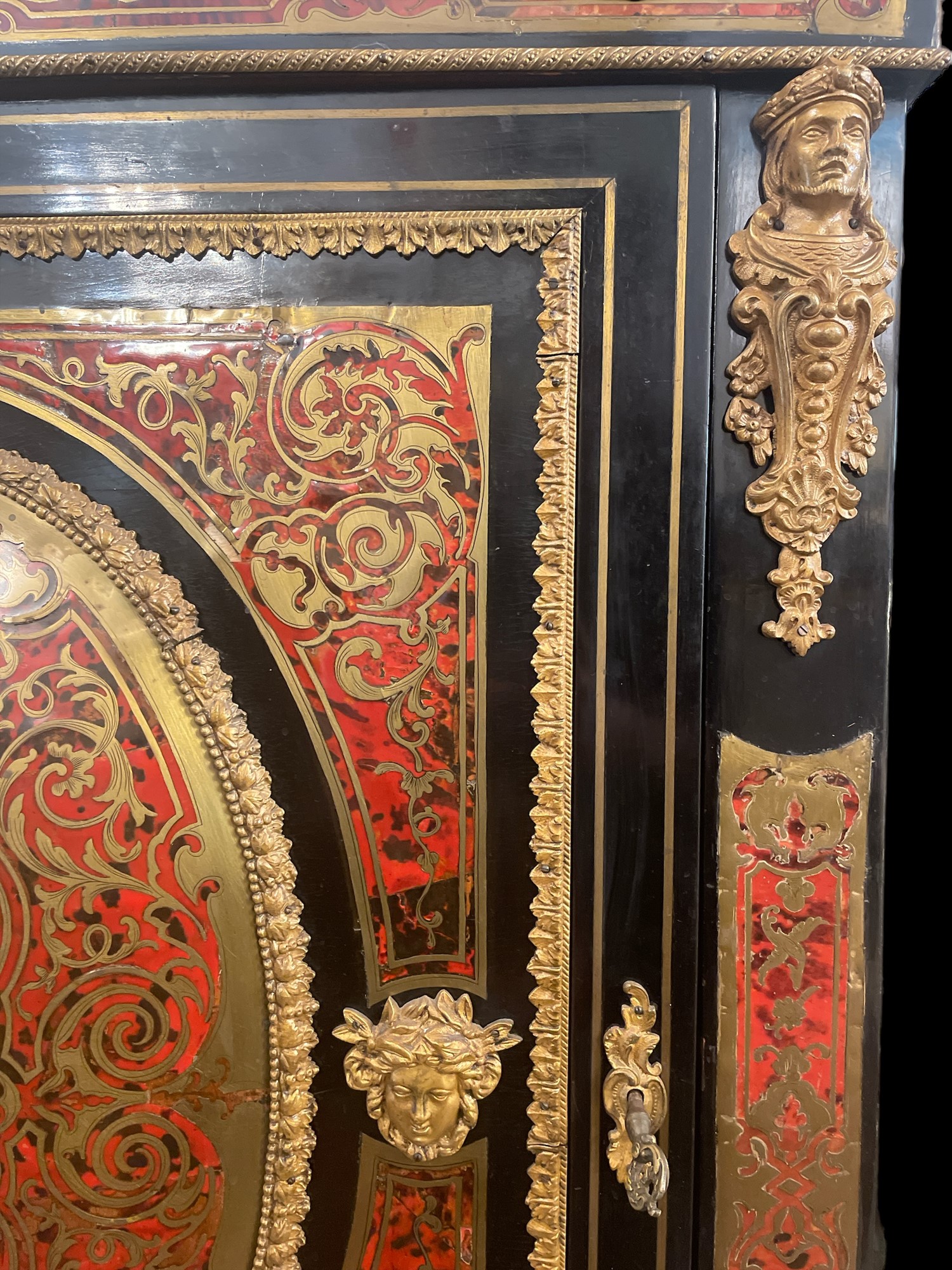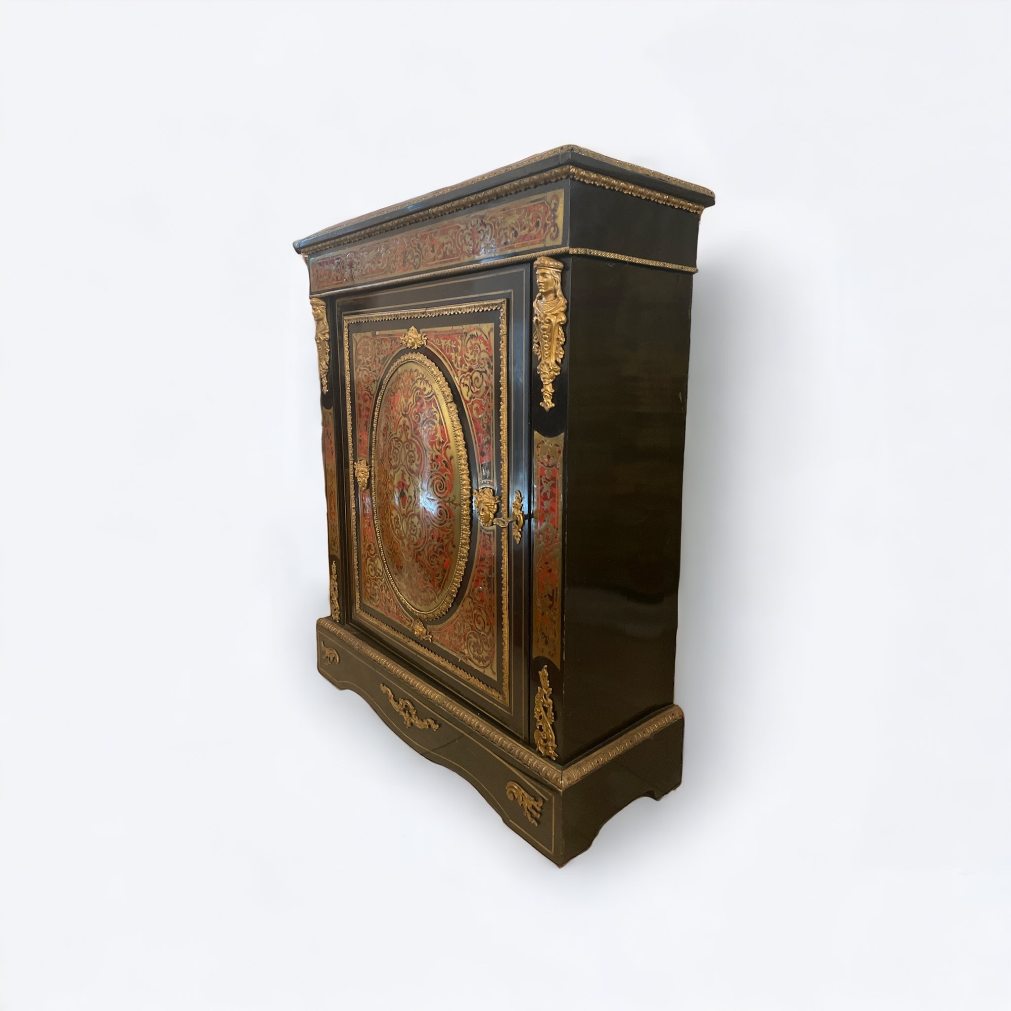 con sportello in legno ebanizzato e intarsi in ottone, applicazioni in bronzo dorato. Piano superiore a carattere. Manifattura francese, periodo Napoleone III