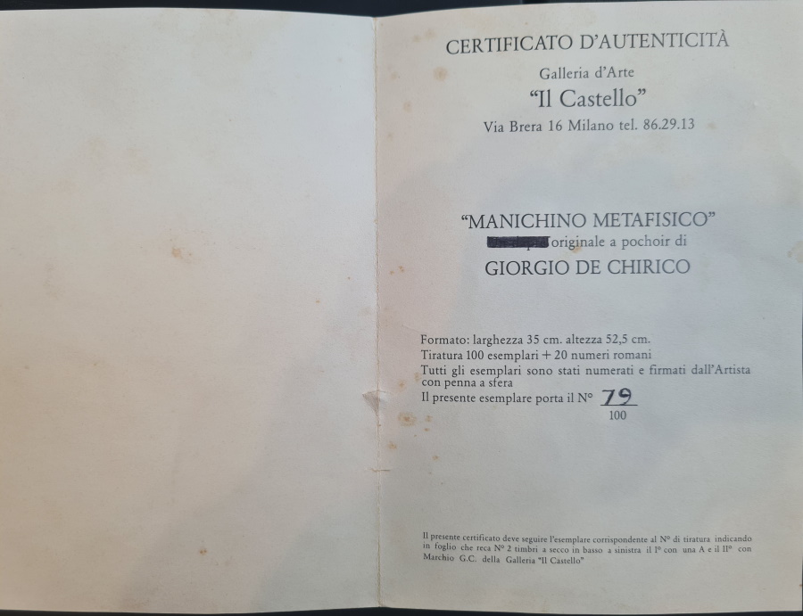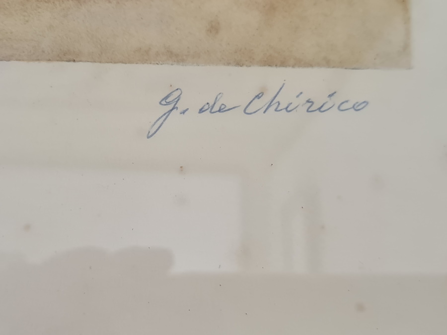 Certificazione: Firmato fronte opera (sulla parte bianca della carta riporta tiratura e firma G. De Chirico con biro mentre la firma sull'opera è stampata) - Certificato di autenticità a cura della Galleria "Il Castello" di Milano