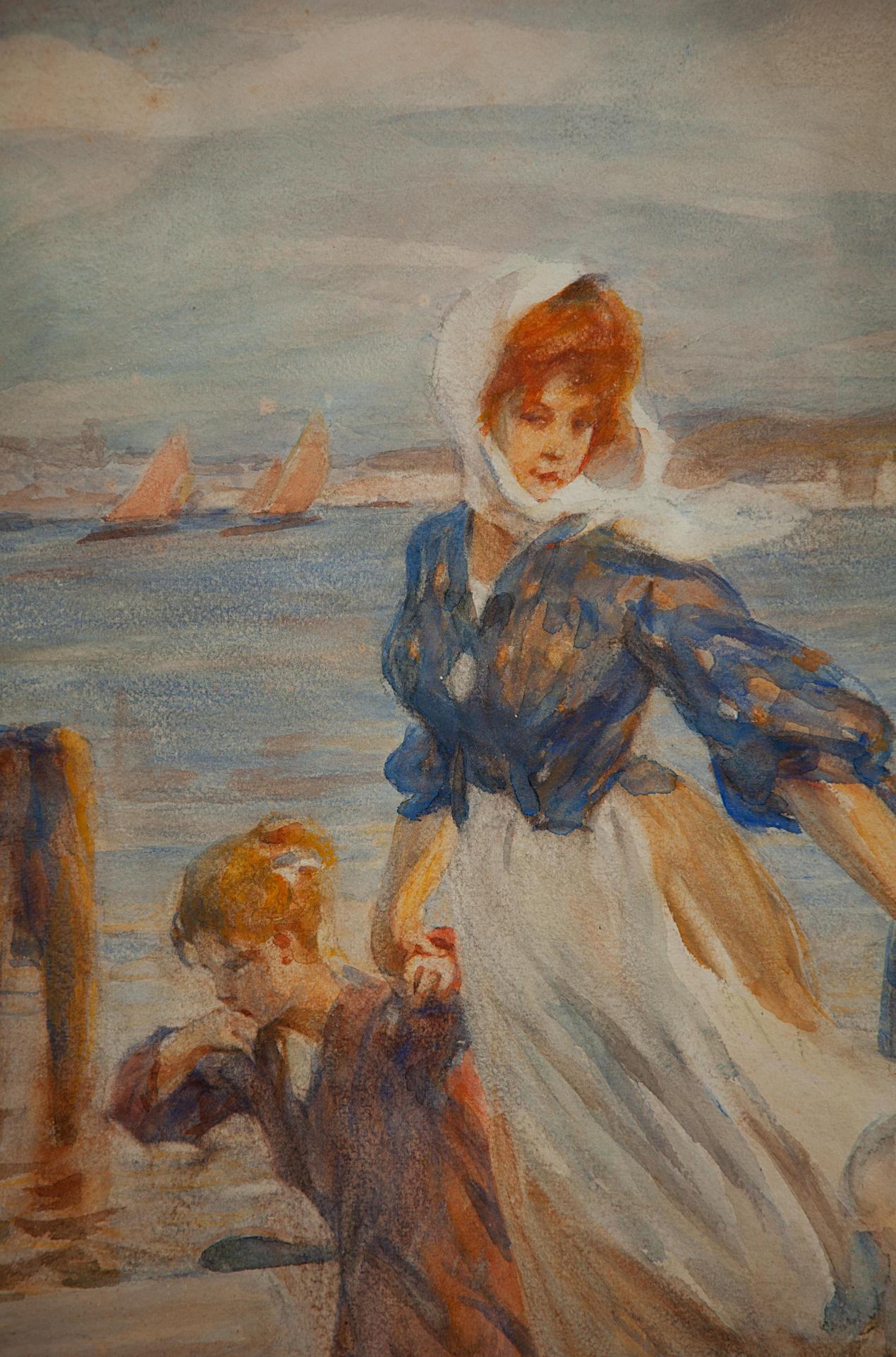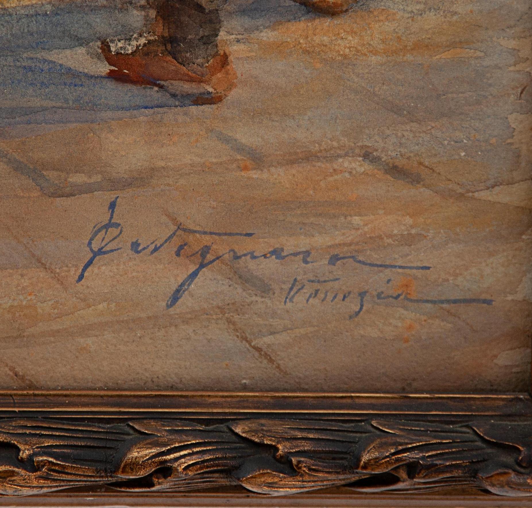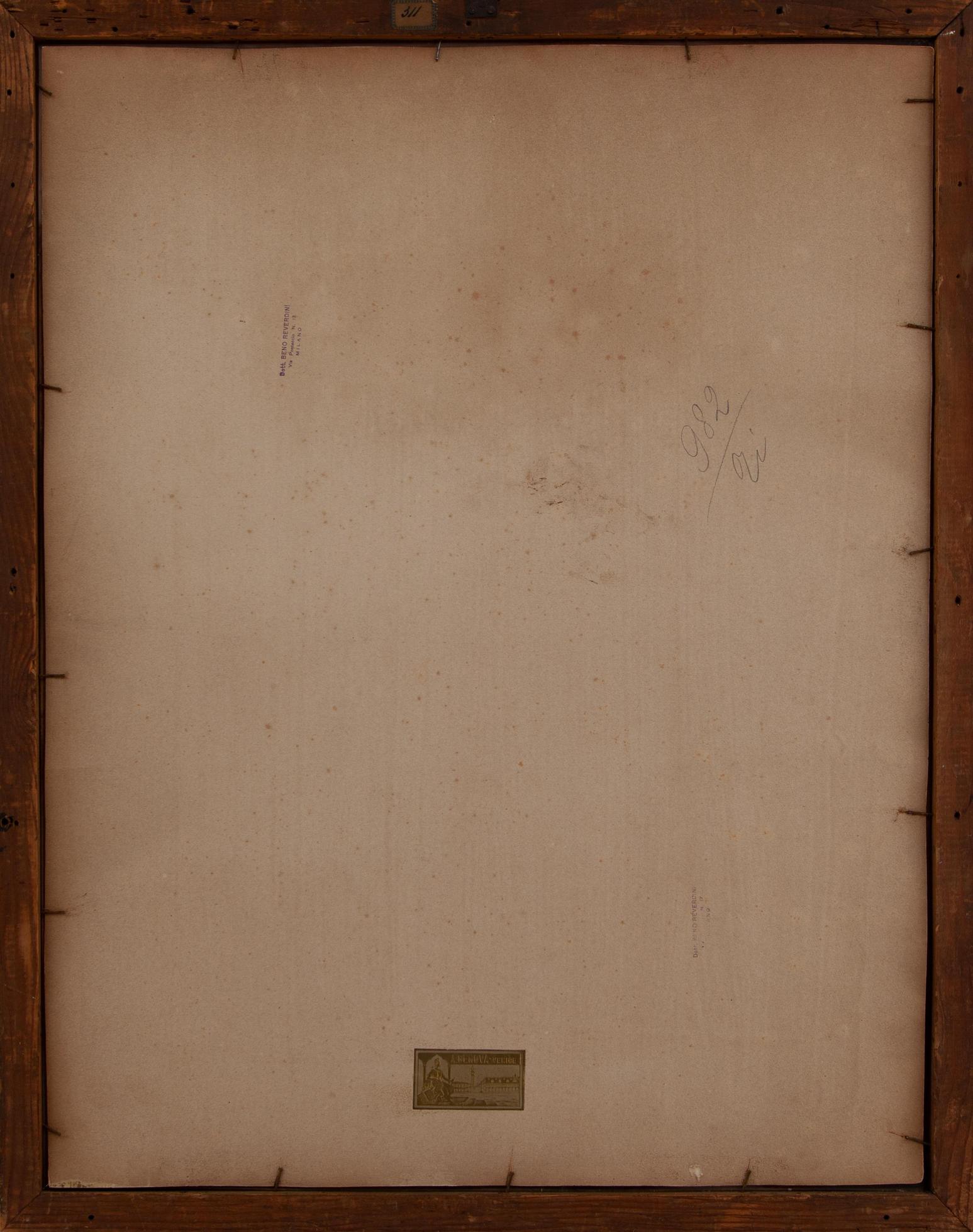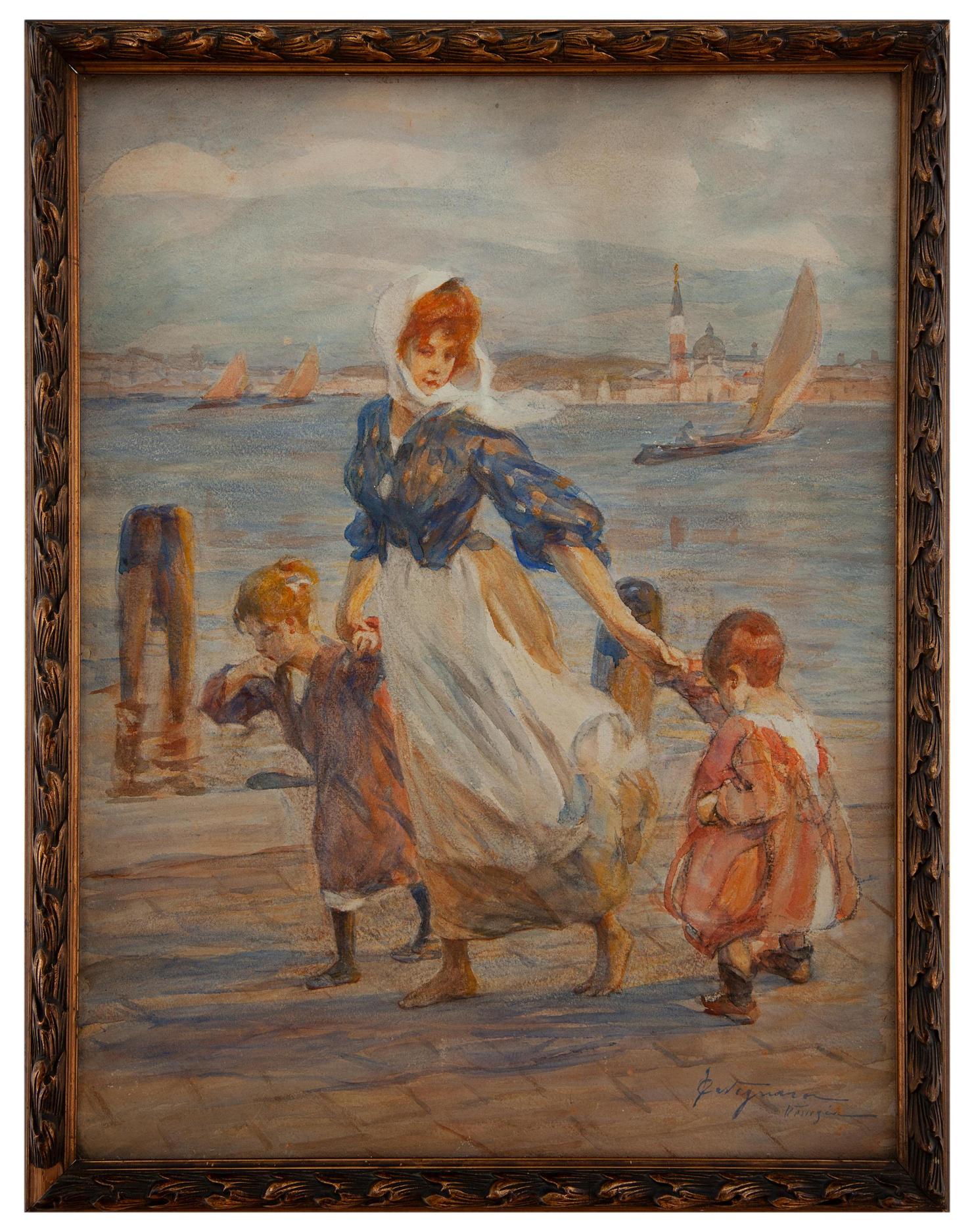 Felice Castegnaro Montebello Vicentino 1872 - Zero Branco 1958 Passeggiata Acquarello su carta cm 65x50 Castegnaro Felice nacque a Montebello Vicentino nel 1872, e i suoi primi passi nel mondo dell'arte furono compiuti all'Accademia Olimpica di Vicenza. Successivamente si trasferì a Venezia, dove si immerso negli studi artistici seguendo i corsi tenuti da E. Tito.Il suo talento artistico emerse chiaramente quando presentò opere con temi lagunari alla Mostra veronese del 1899 e alla Triennale di Milano del 1900, con un particolare lavoro intitolato "Venezia d'estate". Nel 1901, Castegnaro si affermò ulteriormente alla Biennale con l'opera "Raggi d'oro", caratterizzata da una pennellata rapida e una vivace gamma cromatica, diventando un tratto distintivo del suo stile.La sua produzione artistica includeva una varietà di generi, tra cui paesaggi, ritratti e dipinti di figura. Opere significative includono "Maternità" (collezione Cassa di Risparmio, Venezia) e "Mammina" (esposta a Roma, Palazzo del Quirinale). Partecipò attivamente alle biennali veneziane, con contributi notevoli nel 1903 con "Le tabacchinie", e alle mostre di Torino nel 1902 con opere come "Confidenze" e "Al mare". A Roma, nel 1906, presentò "Fondamentina", mentre nel 1911 espose "Falciatori".La carriera di Castegnaro Felice fu caratterizzata da una continua partecipazione a importanti eventi artistici e mostre, consolidando la sua presenza nel panorama artistico italiano dell'epoca. La sua morte nel 1958 segnò la fine di una carriera prolifica e influente, ma il suo contributo artistico continua a essere apprezzato e studiato ancora oggi.