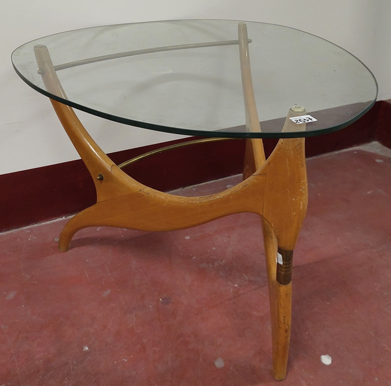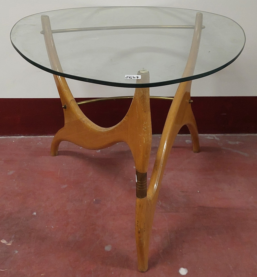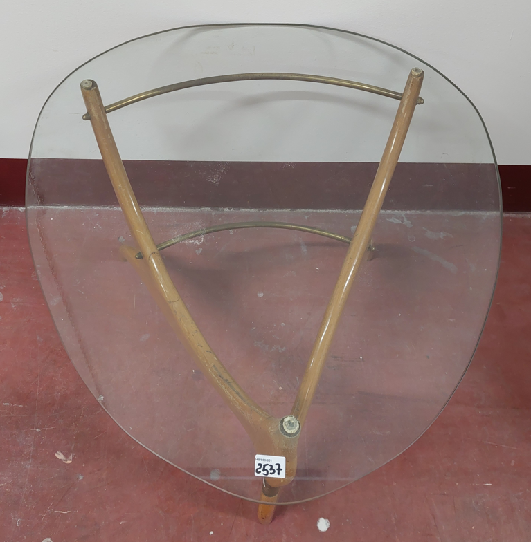 Tavolino da salotto con struttura in legno massello e ottone, piano in cristallo molato. Italia, anni '50. (lievi difetti)