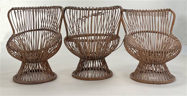 Gruppo di tre poltroncine ispirate al modello "Margherita" di Franco Albini. Esecuzione lombarda, anni '50. Malacca e canna d'India. (cm 70x80x80) (difetti)