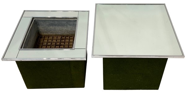 Lotto composto da una fioriera e un tavolino con piano specchiato e bordato in acciaio, corpo parallelepipedo rivestito in moquette verde. Milano, anni '70. (lievi difetti)