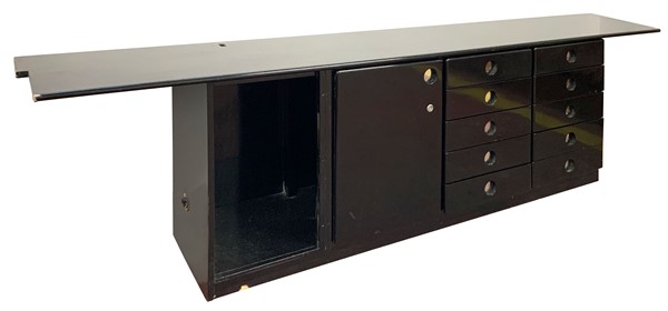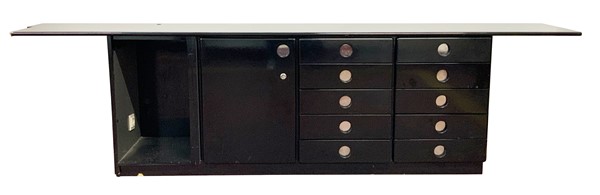 Mobile contenitore a cassetti e due vani in legno laccato nero. Italia, anni '70. (cm 278x74x47) (gravi difetti e mancanze)