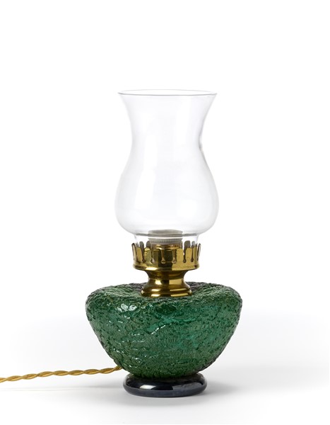 Lampada da tavolo in vetro soffiato verde fortemente corroso all'acido e iridato sulla superficie esterna. Base applicata a caldo, paralume in vetro soffiato trasparente, montatura in ottone. Anni '50. (h cm 33,7) (lievi difetti)
