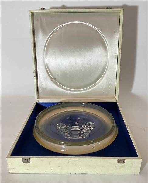 Centrotavola in cristallo incolore opalescente e giallino. Olanda, seconda metà secolo XX. Firmato a punta sotto la base "LEERDAM UNICA FM81077".