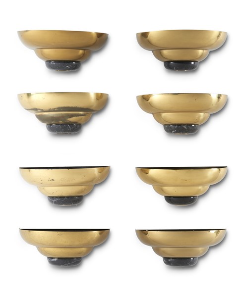 Otto lampade da parete con struttura in ottone e marmo venato grigio. Italia, a