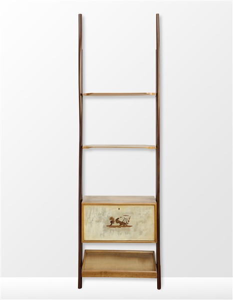 Libreria da centro. Italia, anni '50. Montanti in mogano massello, due ripiani e portariviste impiallacciato in legno chiaro e uno stipo rivestito in pergamena con intarsio in legni diversi sullo sportello a ribalta. (cm 83xx33) (lievi difetti)