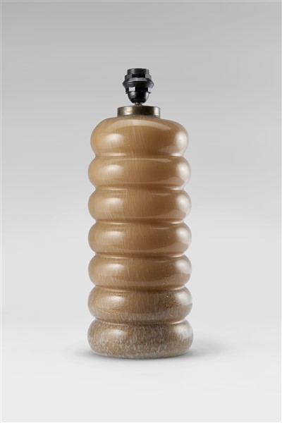 Lampada da tavolo con corpo a costolature orizzontali in vetro soffiato beige opaco e a macchie lattimo con applicazione di foglia d'oro. Anni '60/'70. (h cm 50)
