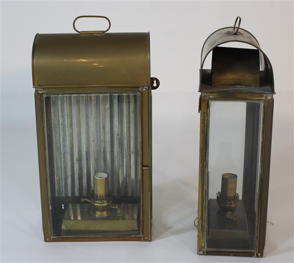 Due grandi applique a vetrina con struttura in lastra di ottone e cristalli bisellati. Anta laterale apribile. Probabile esecuzione inglese, anni '20/'30. (lievi difetti e mancanze)