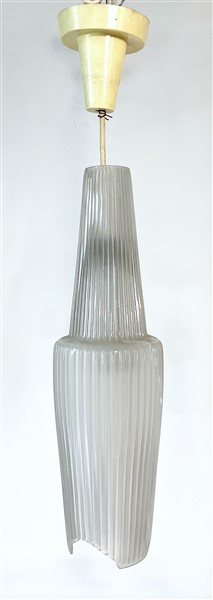 Lampada a sospensione con diffusori in vetro soffiato in stampo incolore costolato, rosetta in plastica verniciata bianca. Italia, anni '60/'70. (gravi difetti)