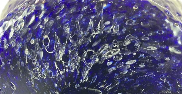 Scultura in vetro pulegoso blu opaco iridato sulla superficie esterna. Anni '90. (h cm 28) (gravi difetti e mancanze)