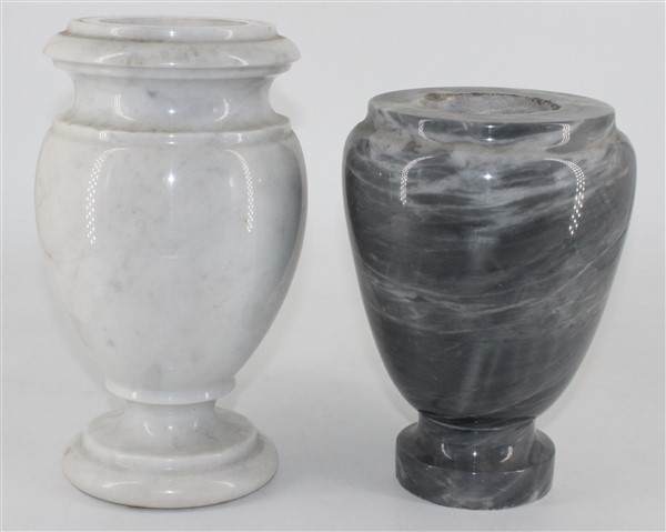 Due vasi a balaustro in marmo grigio e marmo di Carrara. Italia, anni '70. (h max cm 26)