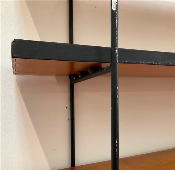 Libreria con ripiani in legno e montanti in metallo nero. Anni '60. (lievi dife
