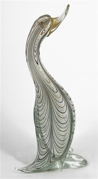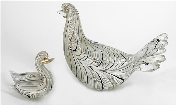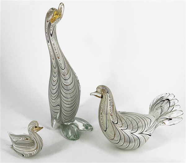 Lotto composto da tre figure di volatili in vetro soffiato incolore con decoro fenicio in vetro lattimo nero e avventurina. Seconda metà secolo XX. (h max cm 35) (lievi difetti)