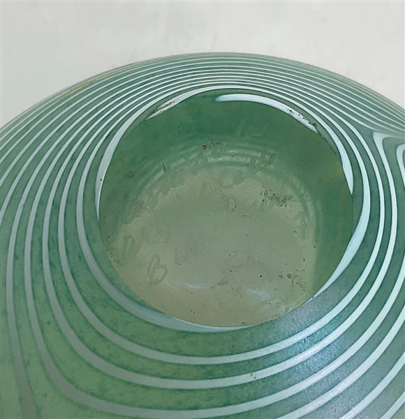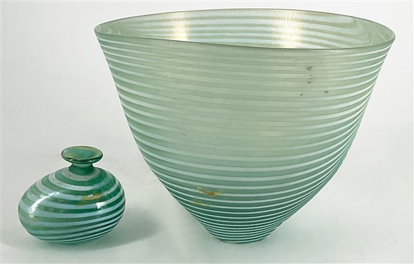 Lotto composto da due vasi in vetro soffiato verde trasparente a fasce lattimo. Esecuzione Kosta Boda, Svezia, seconda metà secolo XX. Iscritti sotto la base. (h max cm 14)