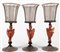 Lotto di sei calici in vetro soffiato costolato fumé trasparente, decorati con dragoni in pasta vitrea rossa e applicazione di foglia d'oro. Seconda metà secolo XX. (h max cm 28)