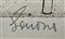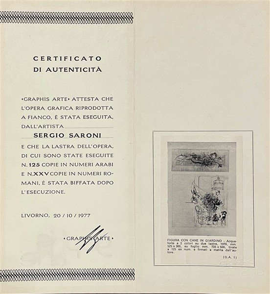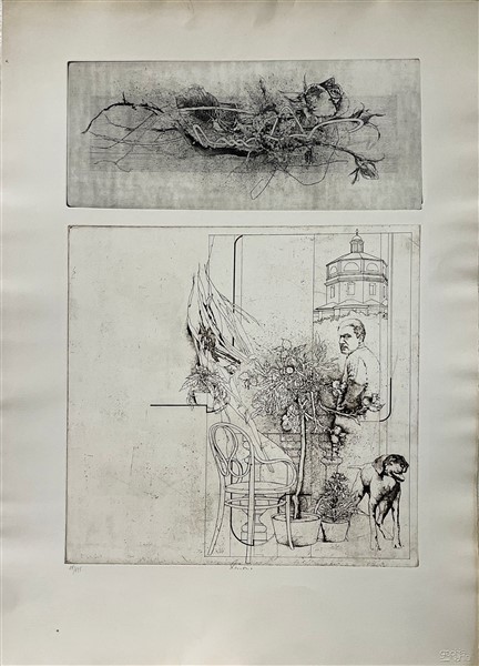 Sergio Saroni "Figura con cane in giardino" 1976 acquaforte a due colori su due