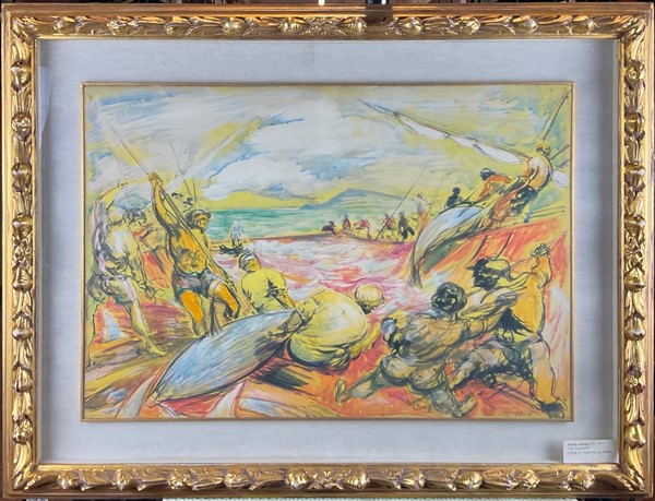 Aligi Sassu "La tonnara" tecnica mista su cartoncino applicato su masonite cm 4