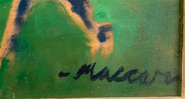 Mino Maccari "Gioco di bimbi" 1986 olio su compensato cm 44x41,5 firmato in bass