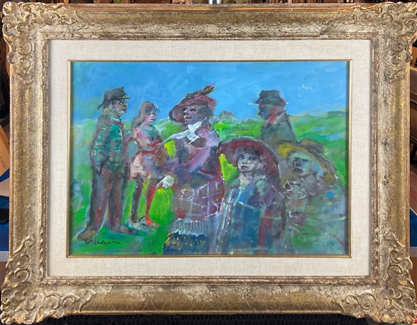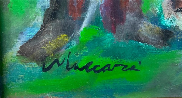 Mino Maccari "A passeggio" olio su compensato cm 40,5x55 firmato in basso a sin