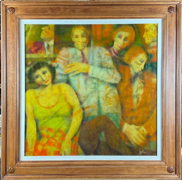 Remo Squillantini "Ricevimento" 1986 olio su compensato cm 60x60 firmato in bass