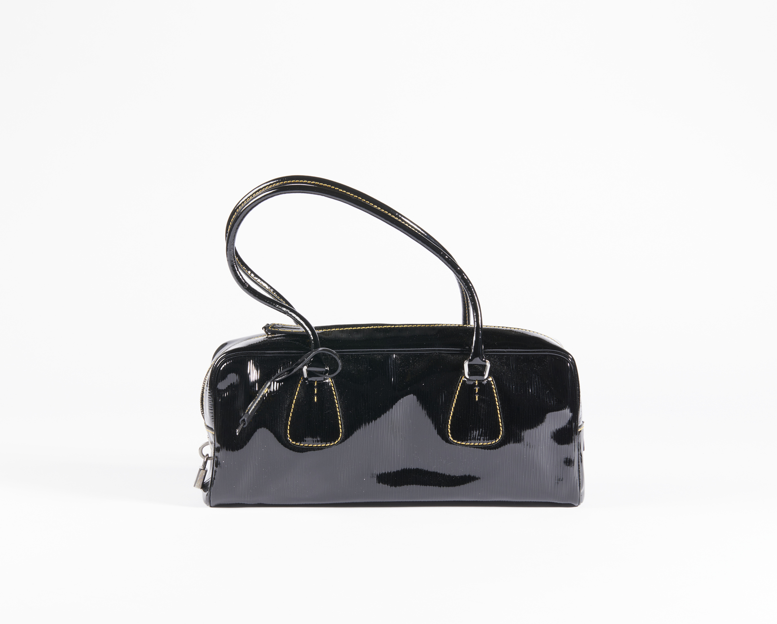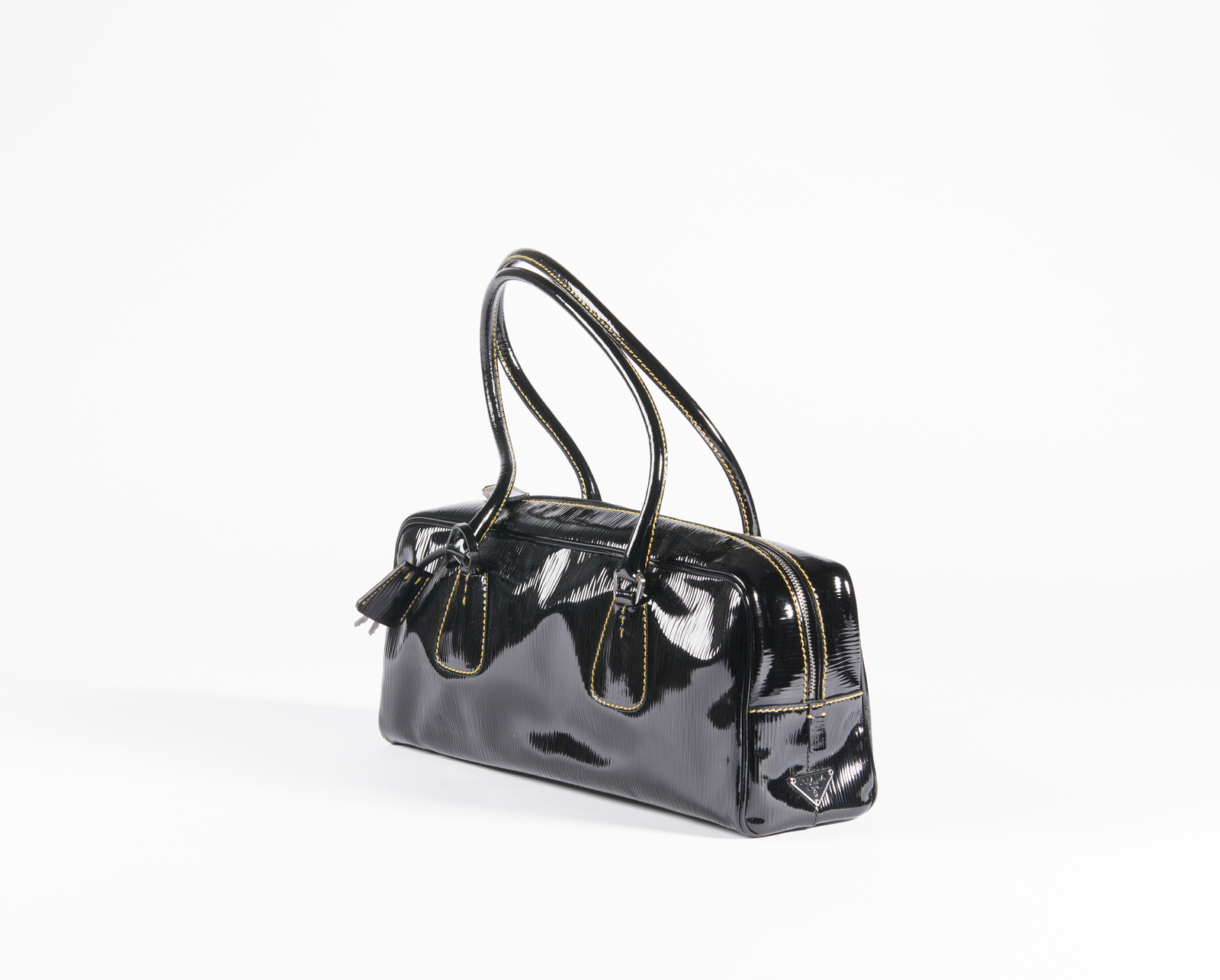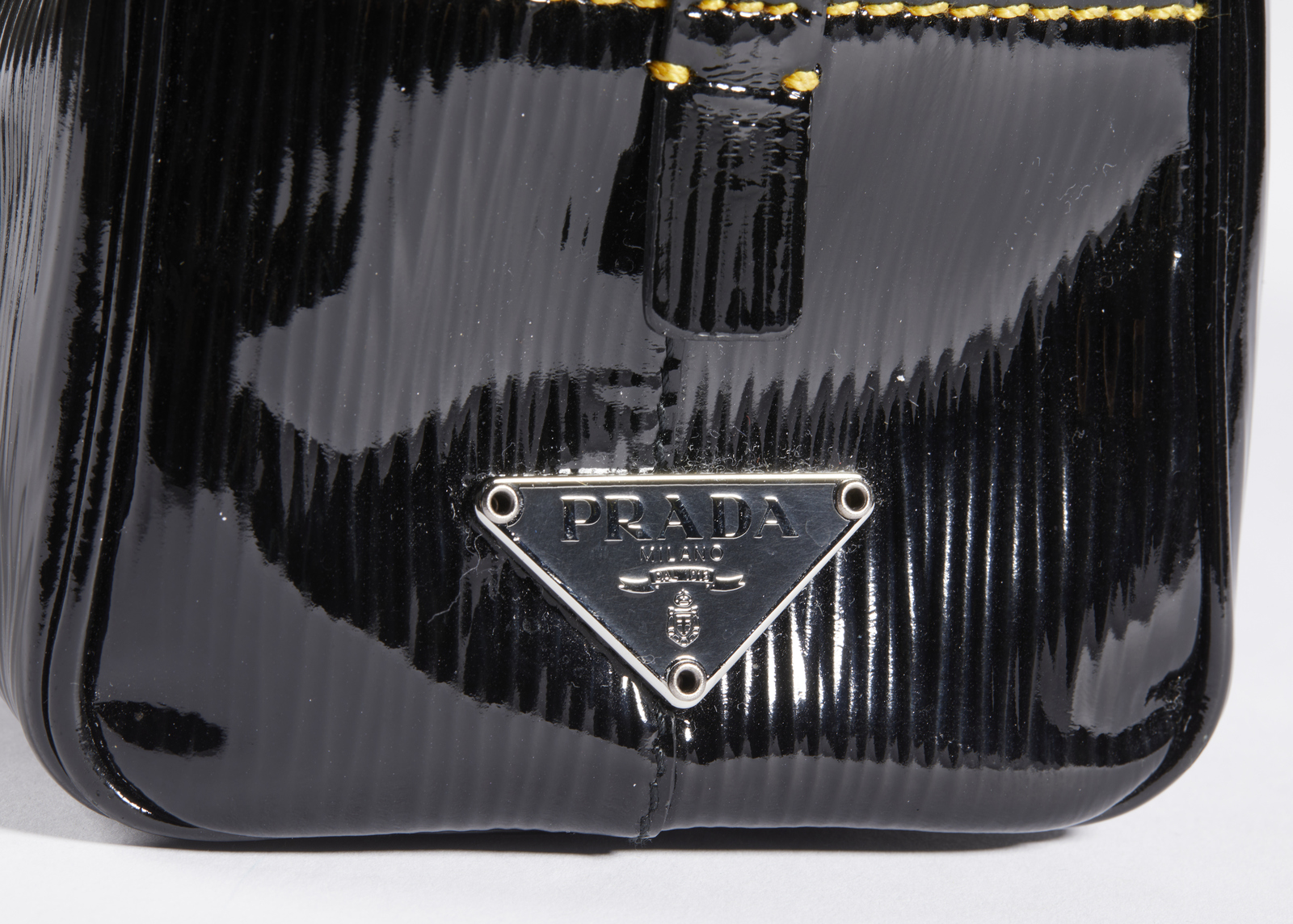 PRADA MILANO Borsa Prada in vernice nera. Pelle. Cm 36,50 x 15,50 x 11,00. Borsa in vernice nera con hardware color argento e cuciture a vista gialle. La borsa è impreziosita da lucchetto e dalle chiavi. Il logo del marchio è presente sul fianco della borsa. L'interno è rivestito dal tessuto griffato Prada ed è presente una tasca portaoggetti con lampo e con logo Prada.