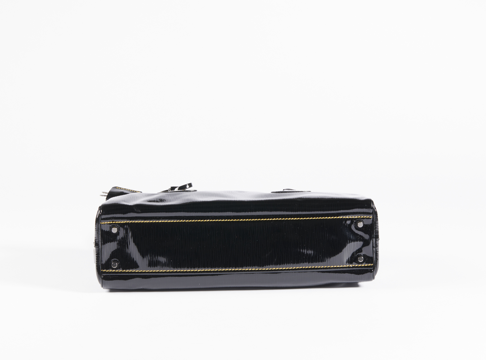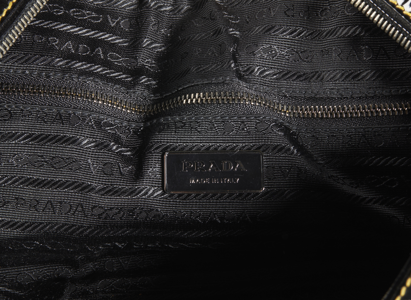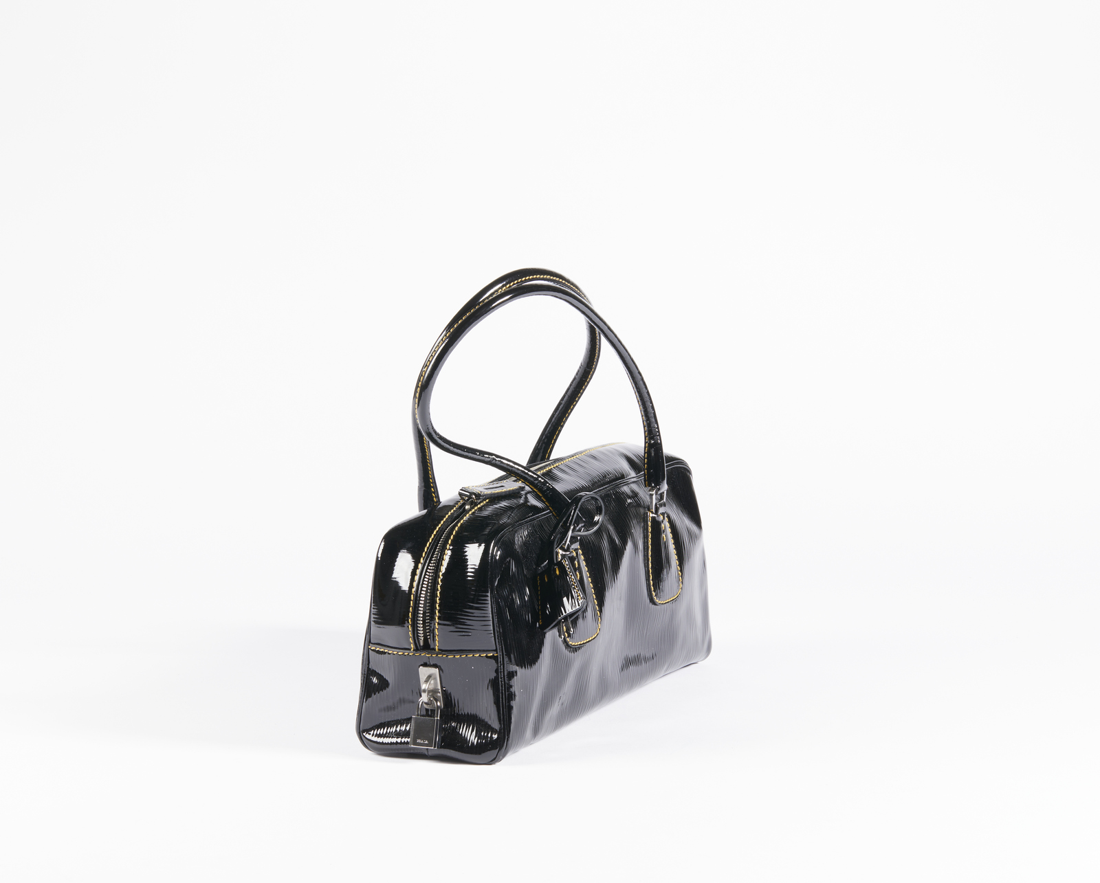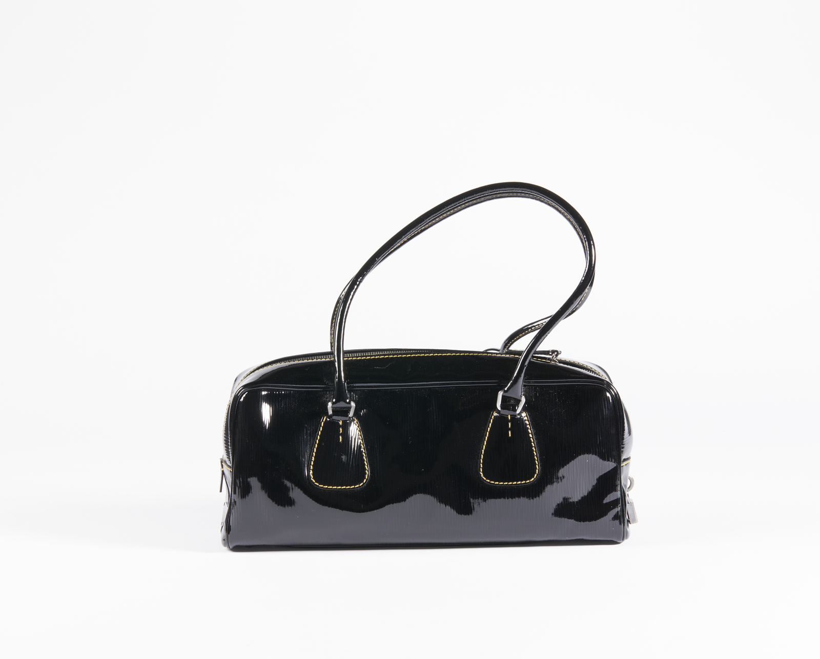 PRADA MILANO Borsa Prada in vernice nera. Pelle. Cm 36,50 x 15,50 x 11,00. Borsa in vernice nera con hardware color argento e cuciture a vista gialle. La borsa è impreziosita da lucchetto e dalle chiavi. Il logo del marchio è presente sul fianco della borsa. L'interno è rivestito dal tessuto griffato Prada ed è presente una tasca portaoggetti con lampo e con logo Prada.