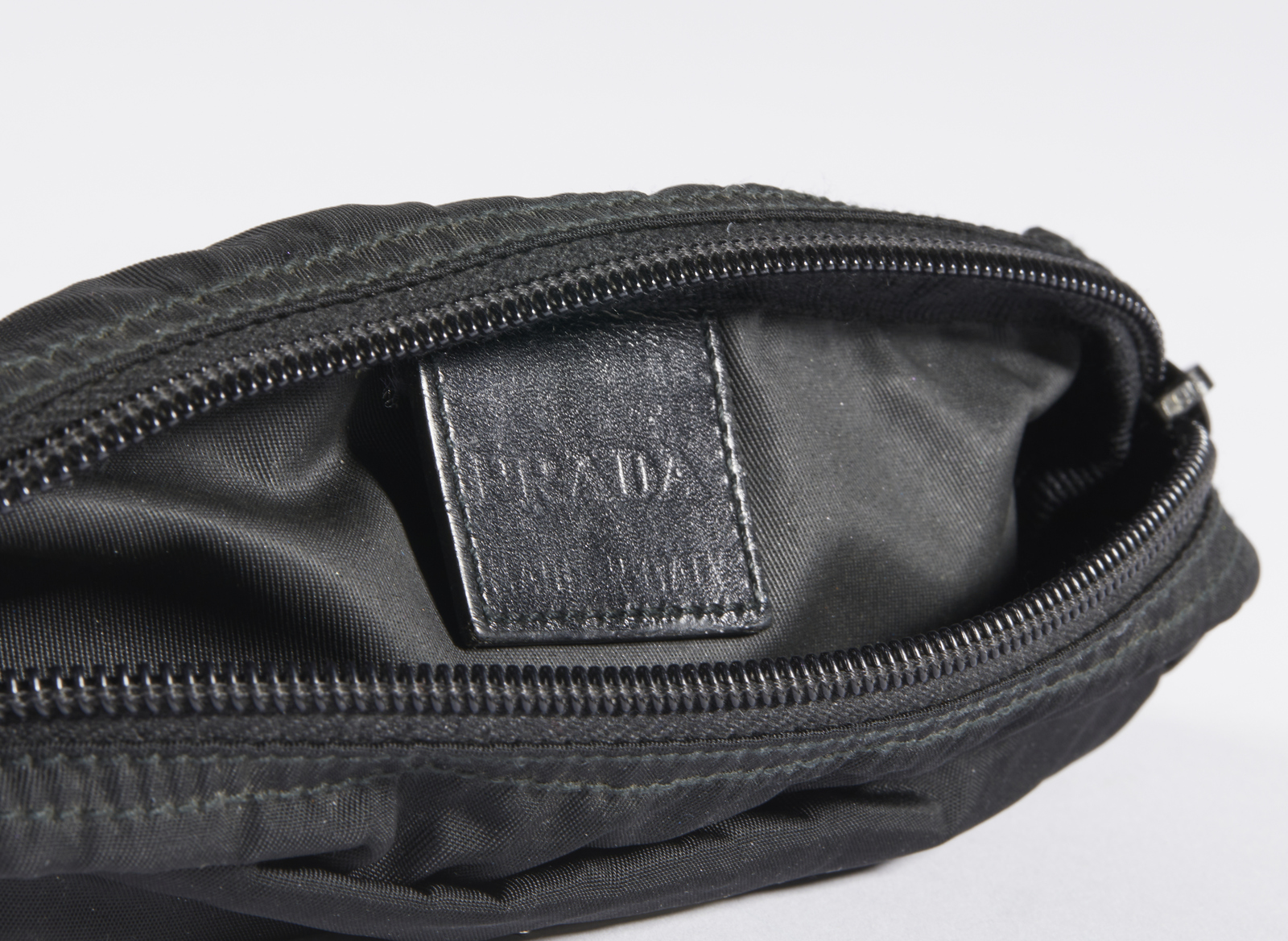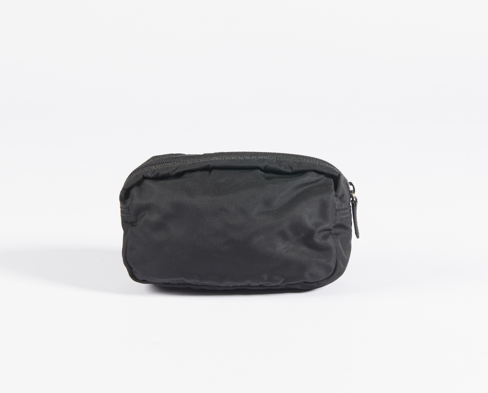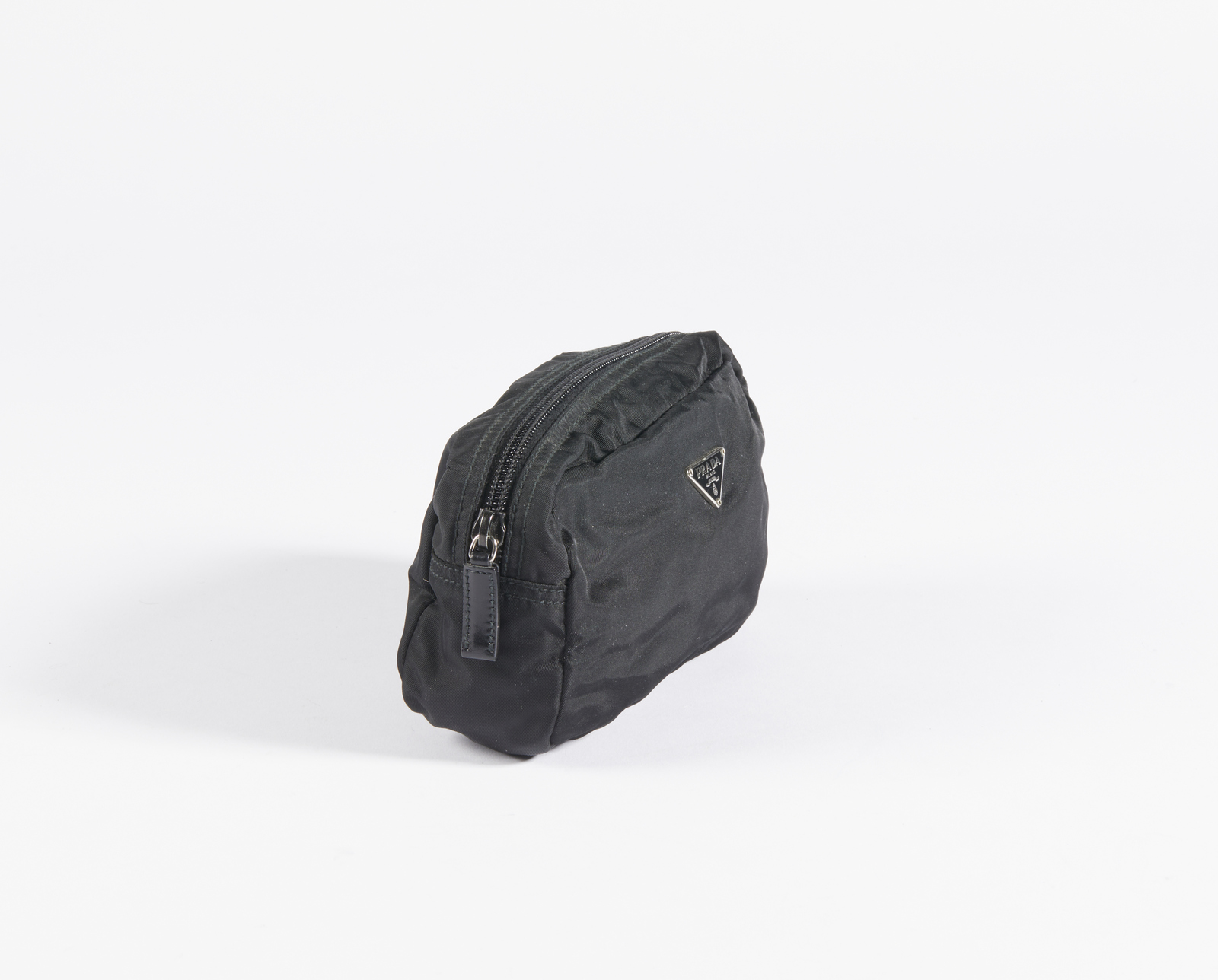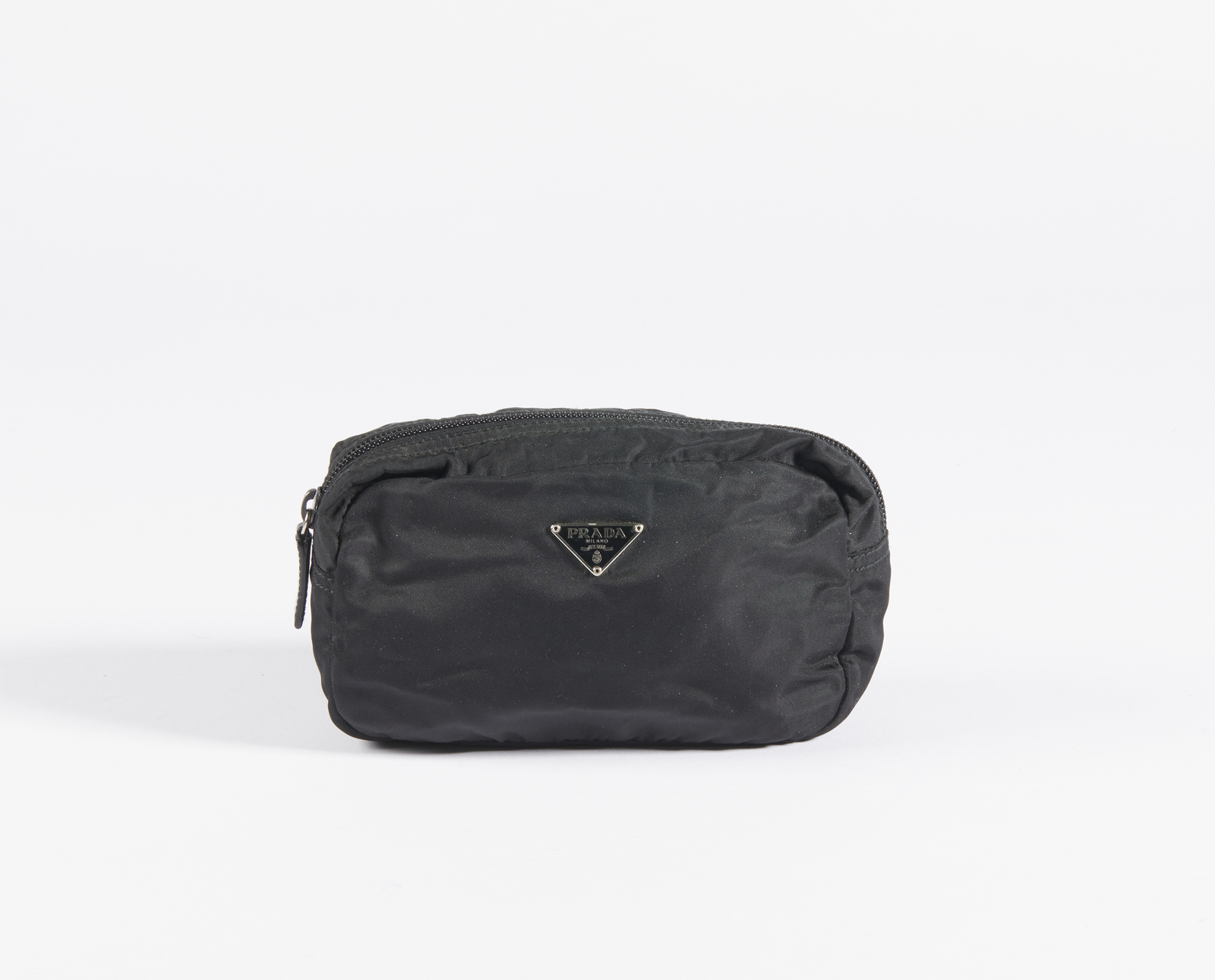 PRADA MILANO Pochette in tessuto nero. Tessuto. Cm 16,00 x 9,00 x 5,50. Pochette in tessuto tecnico. Chiusura con zip, hardware di metallo colore nero. Logo Prada sul fronte.