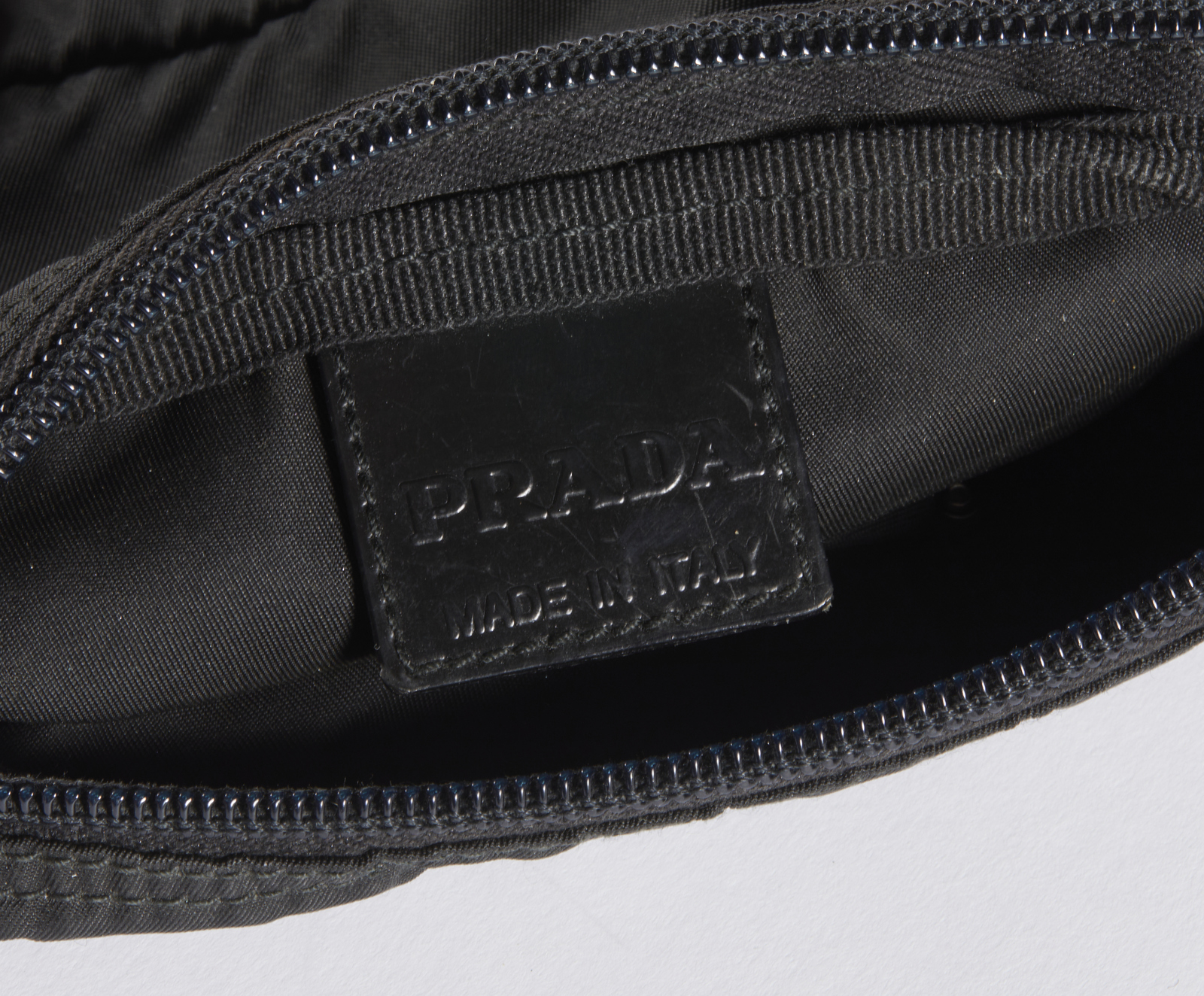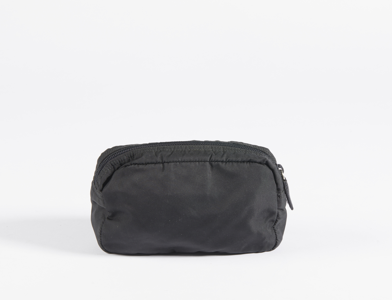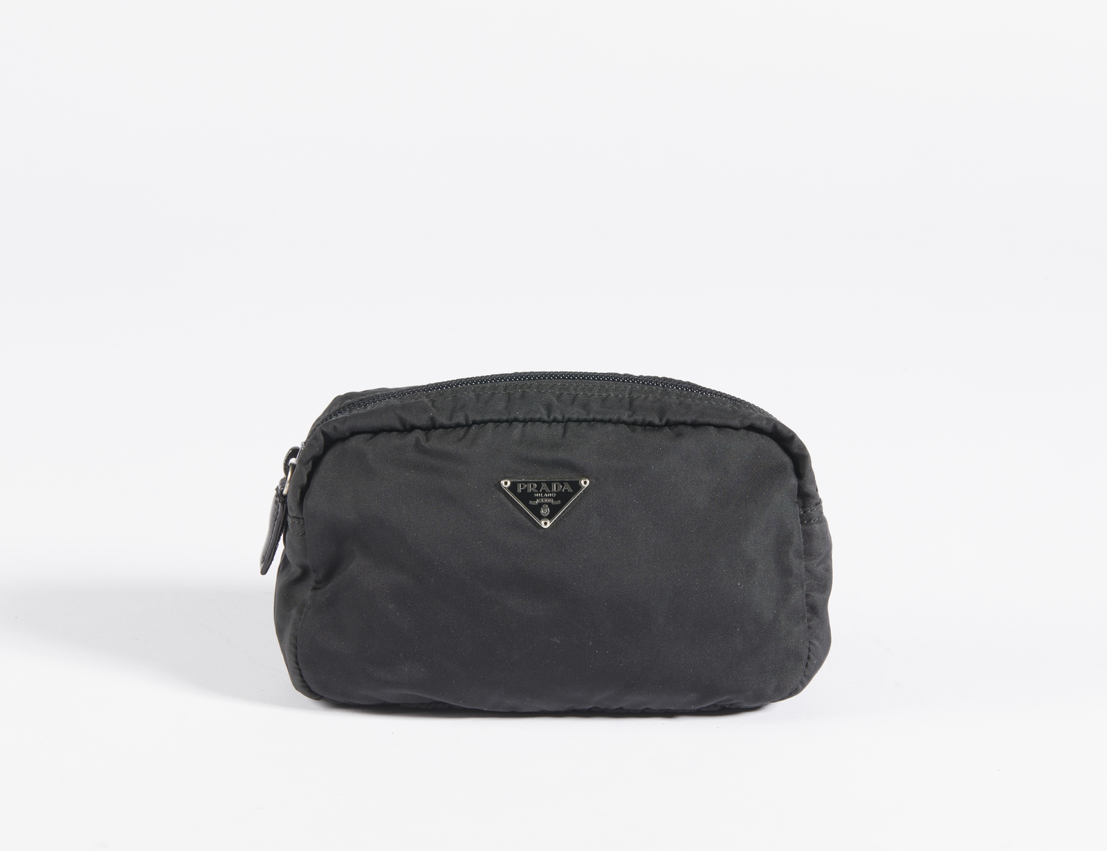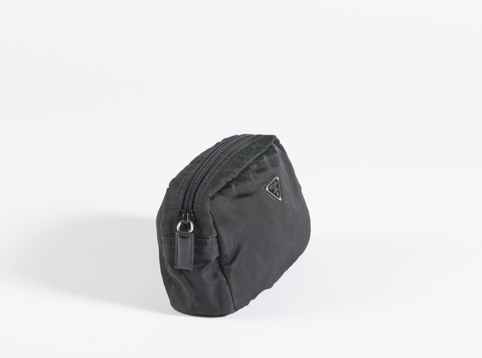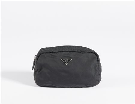 PRADA MILANO Pochette in tessuto nero. Tessuto. Cm 17,00 x 10,50 x 5,00. Pochette in tessuto tecnico. Chiusura con zip, hardware di metallo colore nero. Logo Prada sul fronte.