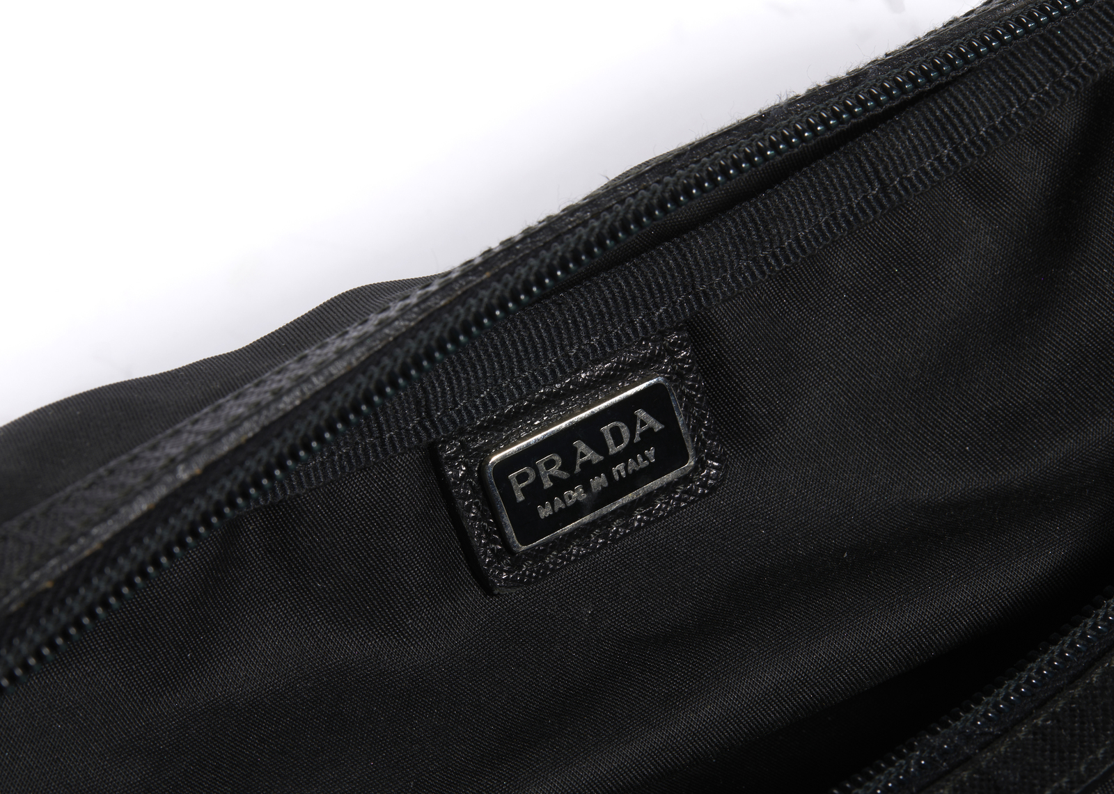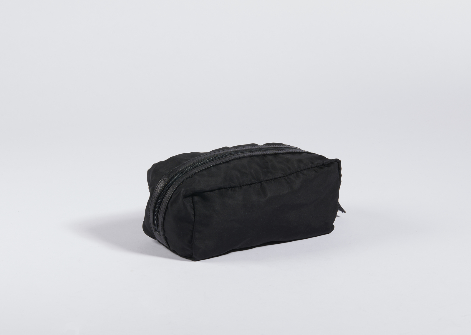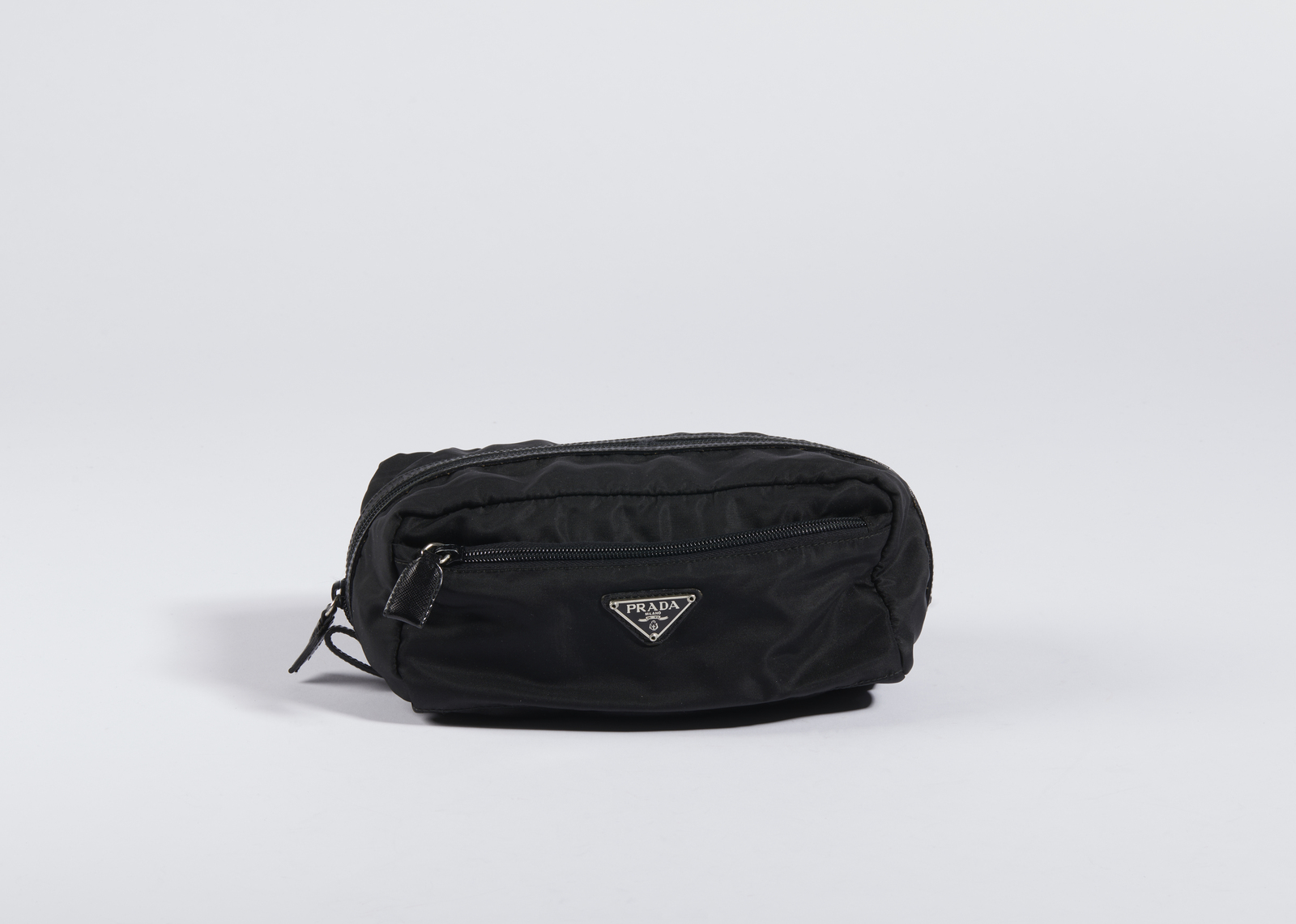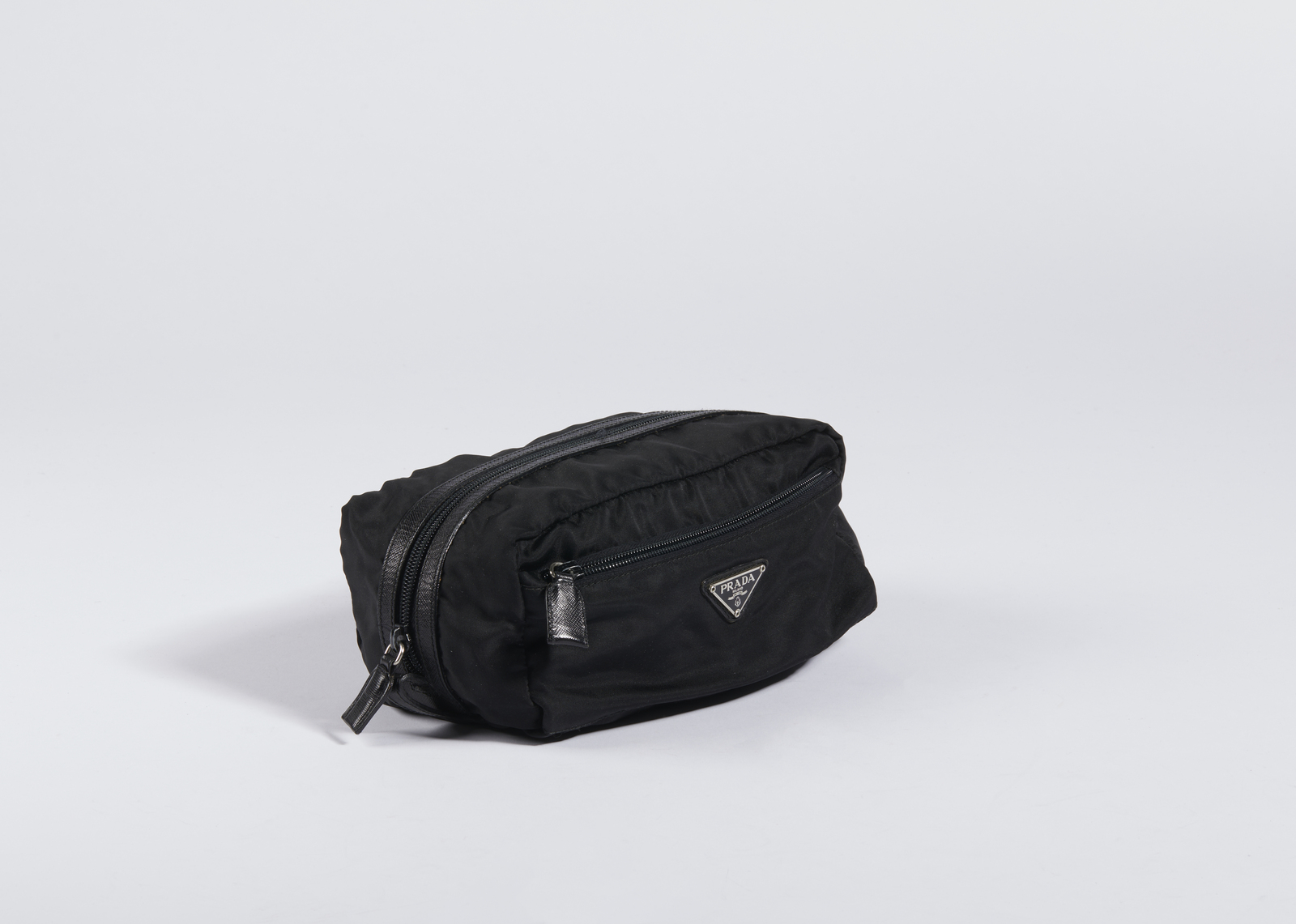 PRADA MILANO Pochette in tessuto nero. Tessuto. Cm 22,00 x 8,50 x 11,00. Pochette nera in tessuto con due scomparti, entrambi con chiusura a zip. Hardware color metallo. Logo Prada sul fronte.