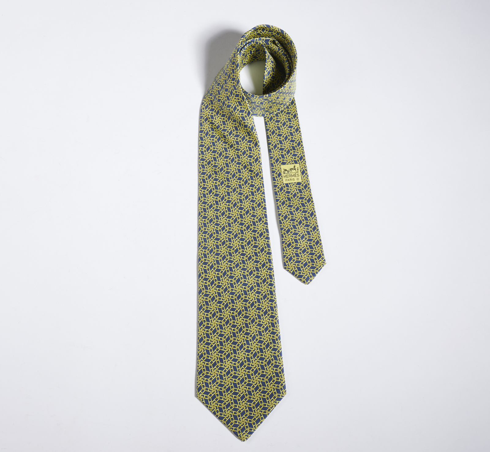 HERMES Cravatta fantasia. Seta. . Cravatta Hermès vintage, fantasia catena maglia chaine d'ancre giallo oro su fondo blu, firma Hermès al verso.