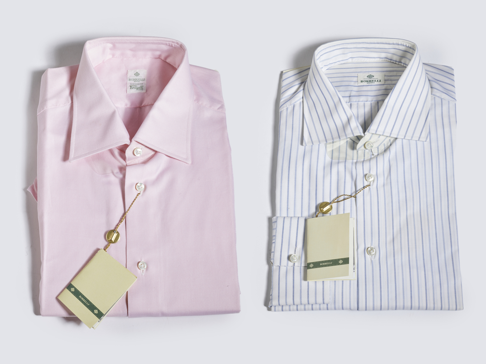 BORRELLI Lotto composto da due camicie. Cotone. . Due camicie classiche Borrelli, una rosa chiara ed una bianca a righe sottili azzurre. Nuove con cartellino. Taglia 17/43,