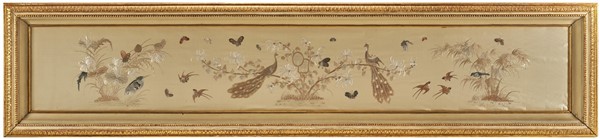 Ricamo in seta nei toni del grigio chiaro, grigio scuro, nocciola, azzurro e beige su fondo di raso di seta color crema. Decoro composto da mazzi di fiori con ideogrammi, due pavoni, volatili e farfalle. In cornice (lievi difetti)