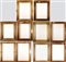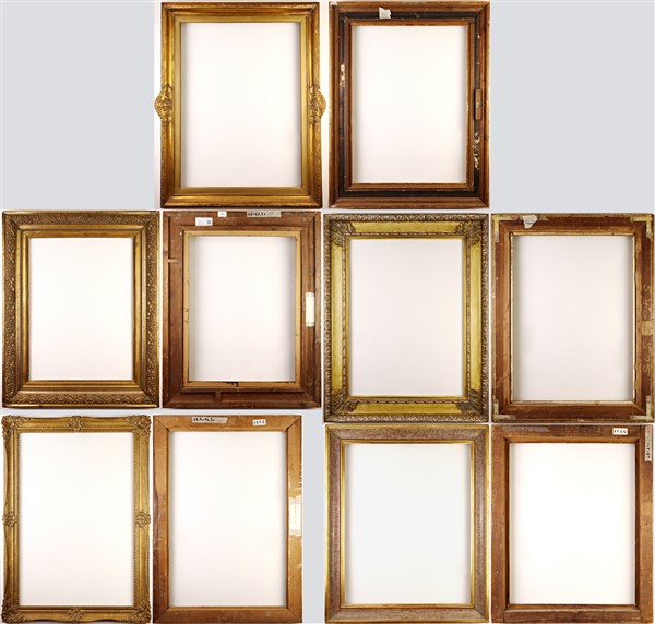 Lotto composto da cinque diverse cornici in legno e altri materiali. Alcune dorate (cm max 88x63) (difetti). Luce di ogni cornice iscritta al retro