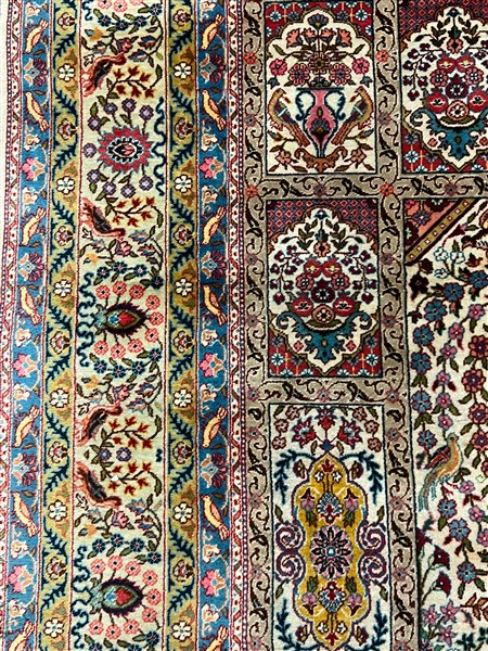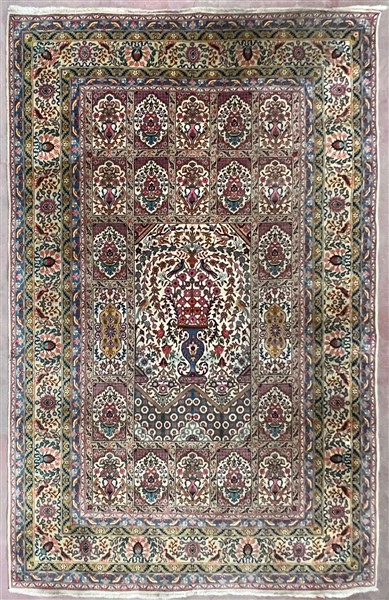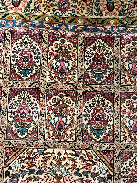 Tappeto Bachtiari, Persia, secolo XX. Decoro a giardino policromo su fondo bianco con animali e vasi fioriti (cm 305x200) (difetti)