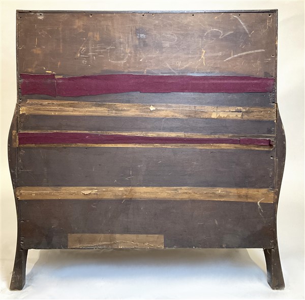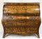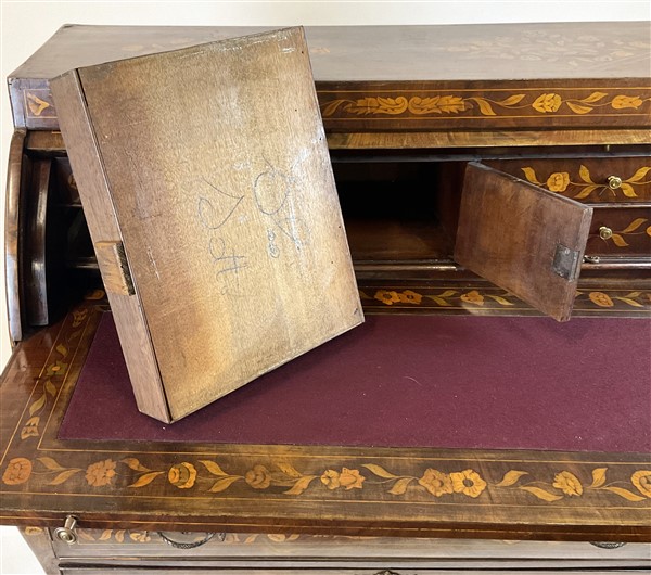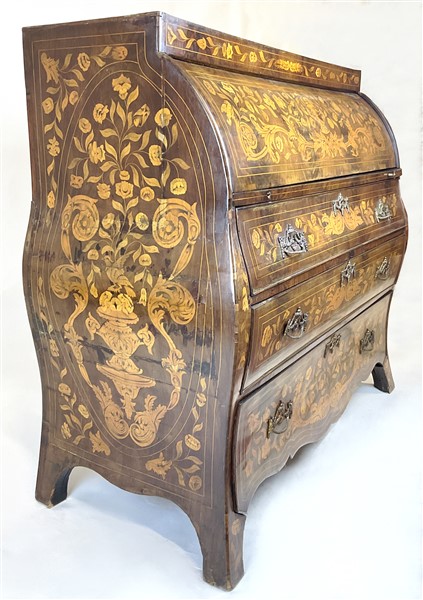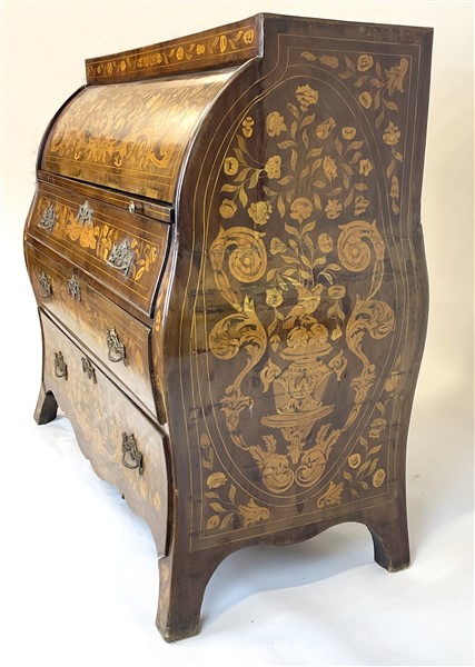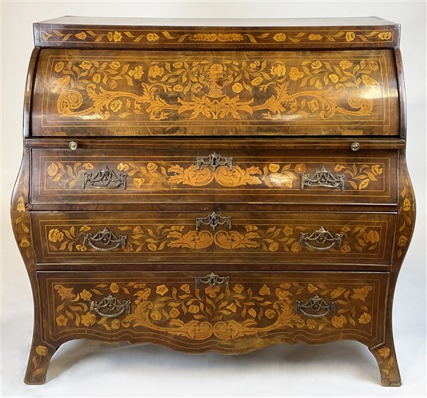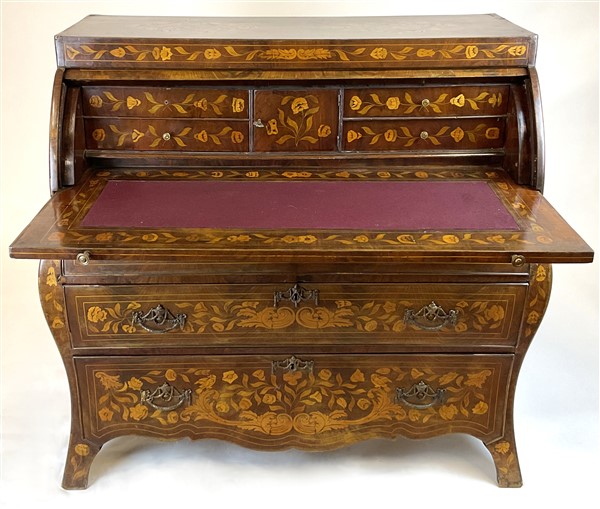 Ribalta bombata in mogano, intarsiata in legni vari a motivi floreali, fronte e fianchi mossi, tre cassetti e calatoia a rullo con piano estraibile celante quattro cassettini e vano con sportello. Olanda, secolo XIX (cm 120x110x56) (difetti e restauri)
