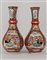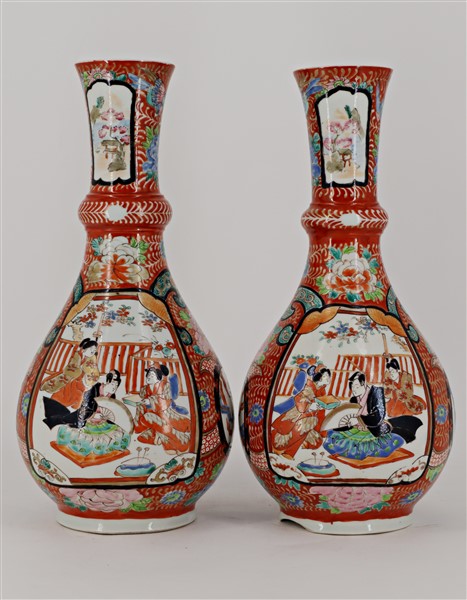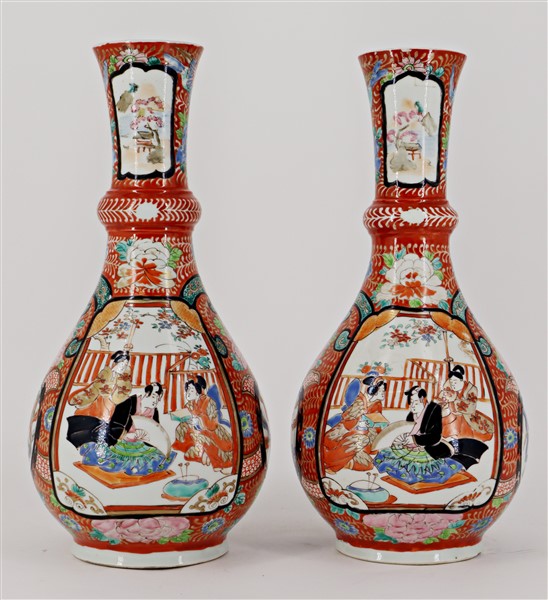 Coppia di vasi a bottiglia in porcellana Arita decorata in policromia a fiori e personaggi entro riserve